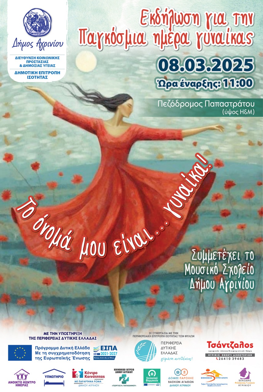 Η Διεύθυνσης Κοινωνικής Προστασίας & Δημόσιας Υγείας με τις Κοινωνικές Δομές και η Δημοτική Επιτροπή Ισότητας, Δήμου Αγρινίου σε συνεργασία με την Περιφέρεια Δυτικής Ελλάδας, στο πλαίσιο της Παγκόσμιας Ημέρας της Γυναίκας, που τιμάται την 8η Μαρτίου, διοργανώνει δράση ενημέρωσης- ευαισθητοποίησης με τίτλο: «Το όνομά μου είναι… γυναίκα!» που θα πραγματοποιηθεί στον Πεζόδρομο Παπαστράτου (ύψος H&M), το Σάββατο, 8 Μαρτίου με ώρα έναρξης 11:00 π.μ.