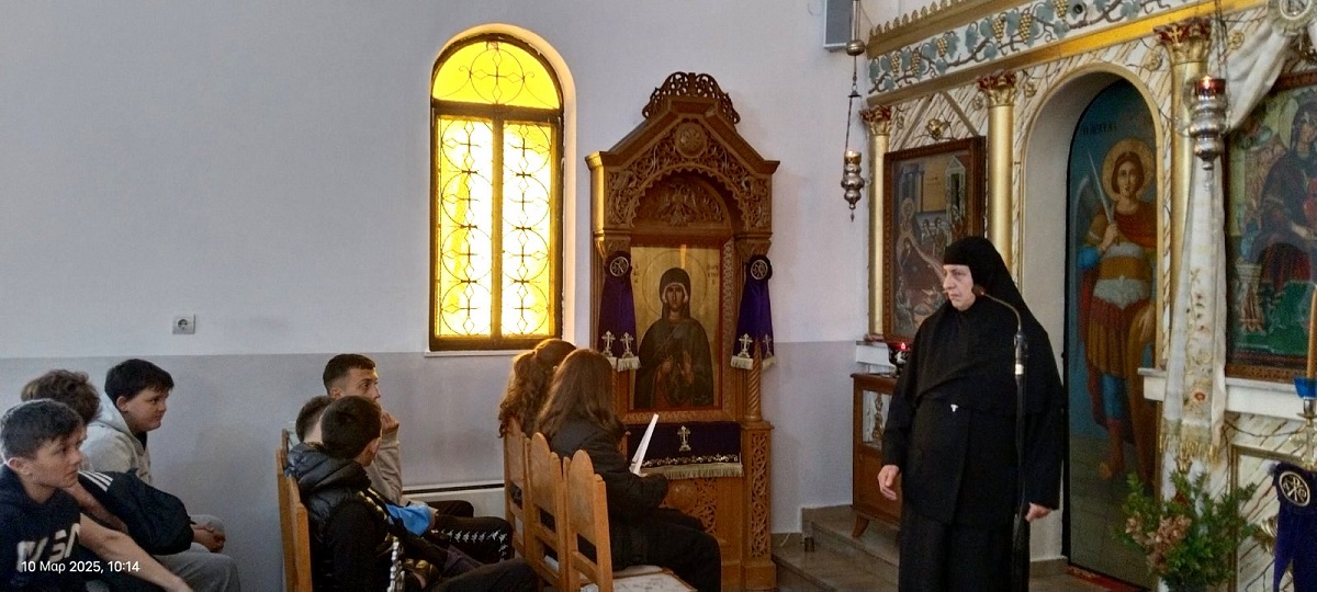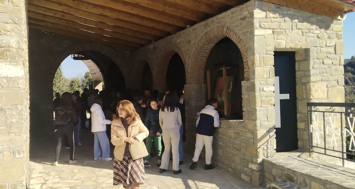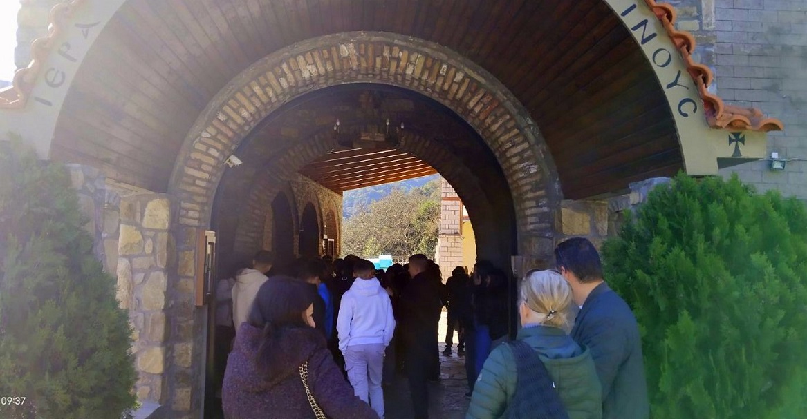 Η σεβαστή και Λογιοτάτη Γερόντισσα Μαριάμ υποδέχθηκε εγκάρδια εκπαιδευτικούς και μαθητές, μαζί με την συνοδεία της. Κατά την ομιλία της αναφέρθηκε στην ιστορία της Μονής, που αποτελούσε στην τουρκοκρατία τόπο καταφυγής και προστασίας για τους υπόδουλους κατοίκους της περιοχής.