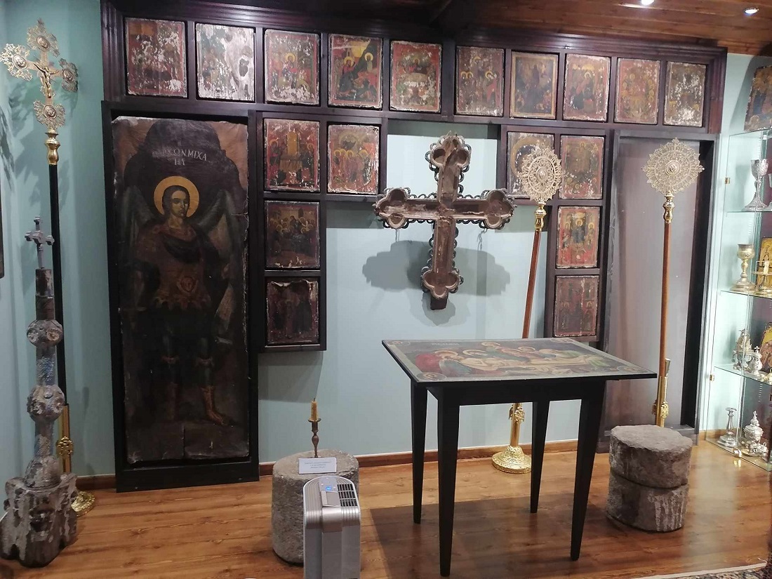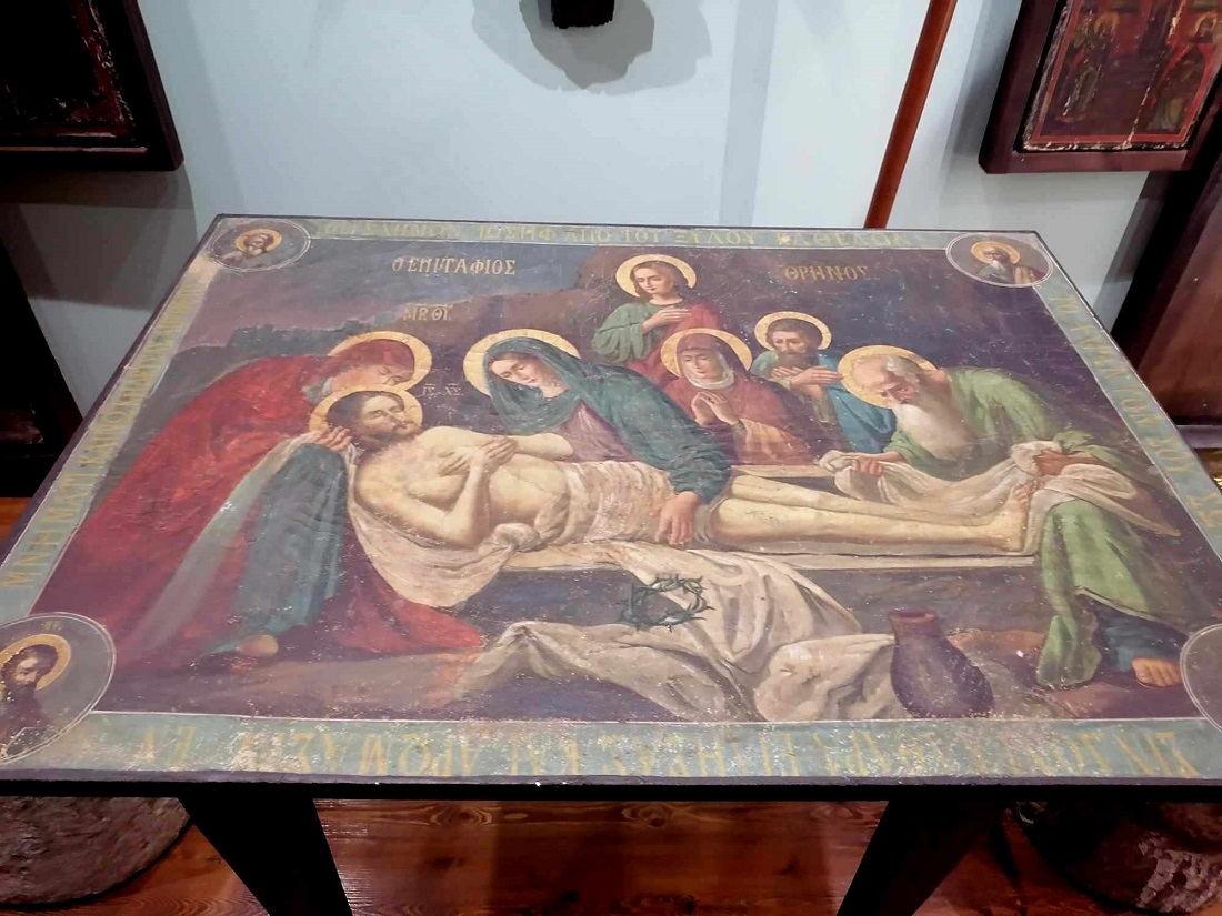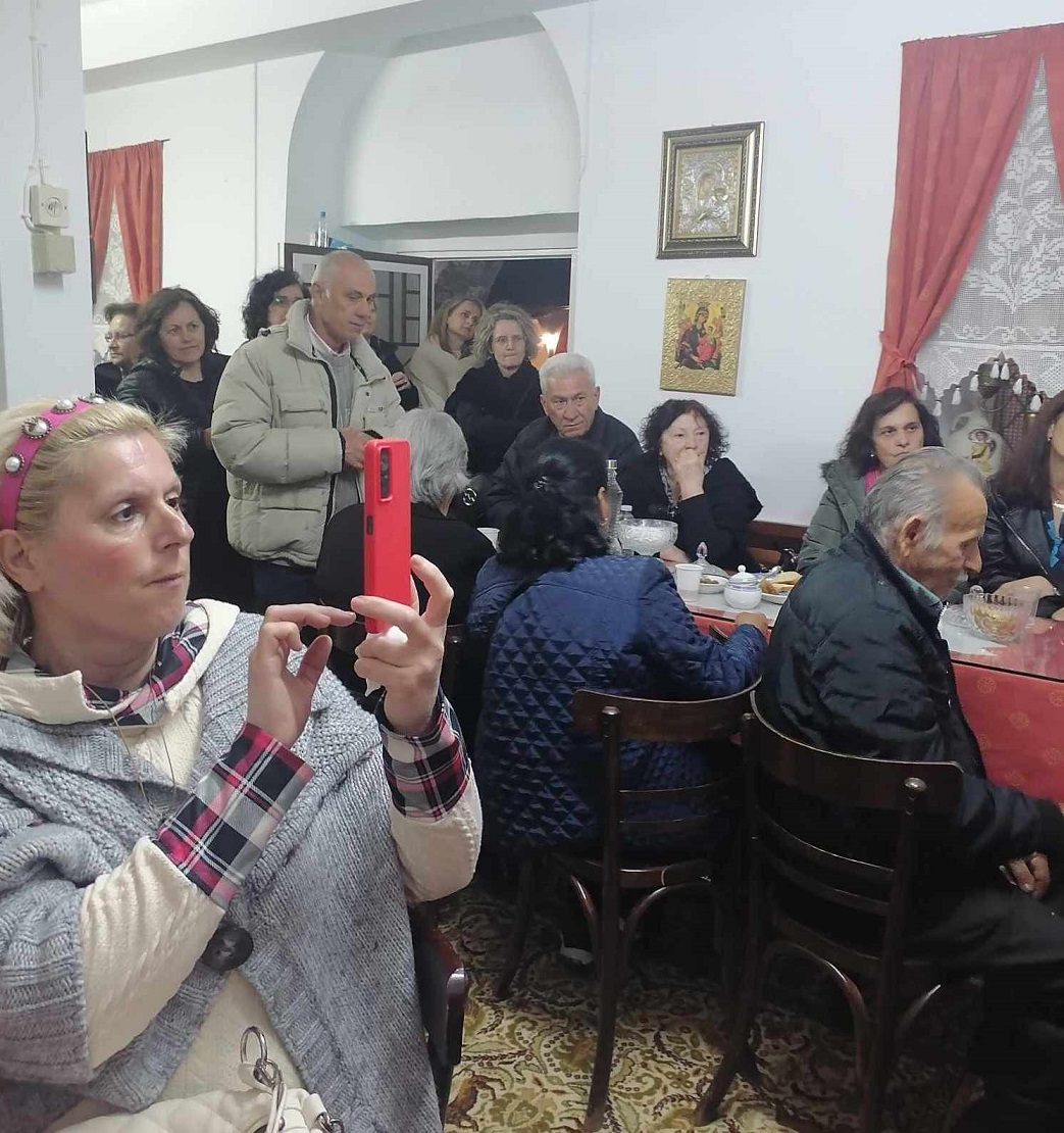 Κατόπιν στο Αρχονταρίκι της ιστορικής Μονής, η σεβαστή Γερόντισσα Μαριάμ υποδέχθηκε εγκάρδια τους προσκυνητές, τους μίλησε για την ιστορία και την προσφορά της Μονής και τους ξενάγησε στην κειμηλιοθήκη – Βιβλιοθήκη.