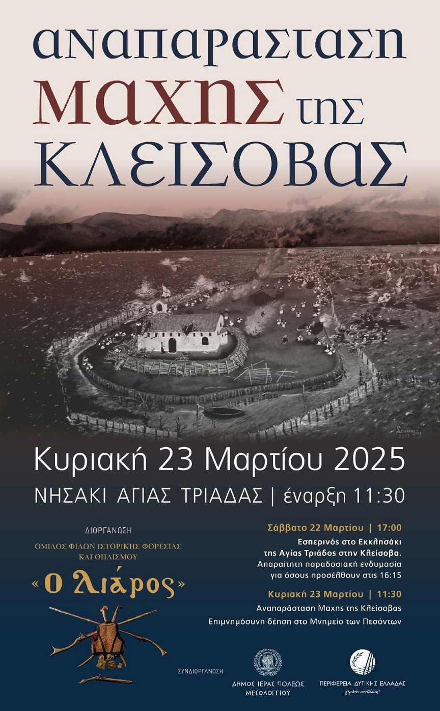 Ο Δήμος Ιεράς Πόλεως Μεσολογγίου, η Περιφέρεια Δυτικής Ελλάδας και ο Όμιλος Φίλων Ιστορικής Φορεσιάς και Οπλισμού «Ο Λιάρος» διοργανώνουν την Αναπαράσταση της Μάχης της Κλείσοβας, η οποία θα πραγματοποιηθεί στις 11:30 το πρωί της Κυριακής 23 Μαρτίου 2025, στο Νησάκι της Αγίας Τριάδας.