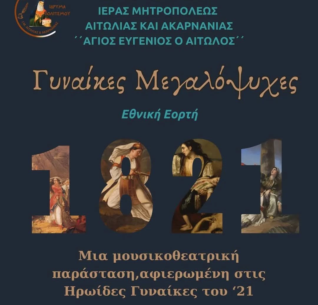 Η Ιερά Μητρόπολη Αιτωλίας και Ακαρνανίας και το Ίδρυμα Πολιτισμού της Ιεράς Μητροπόλεως '' Άγιος Ευγένιος ο Αιτωλός'' τιμώντας την επέτειο της Ελληνικής Επαναστάσεως του 1821, διοργανώνει επετειακή εκδήλωση με τίτλο: «Γυναίκες Μεγαλόψυχες».