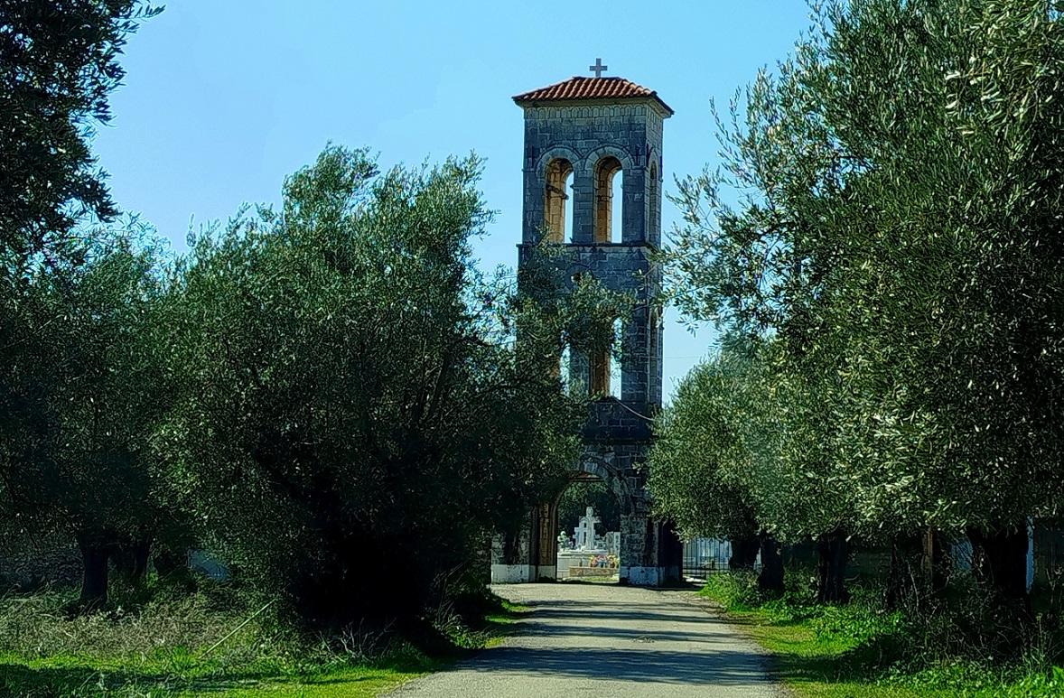 Πιο κει ο παραλίμνιος ναός του Αγίου Νικολάου (κοιμητηριακός), με το τριώροφο πέτρινο καμπαναριό, έργο Ηπειρωτών μαστόρων, που δεσπόζει στον κάμπο και το τείχος του (κουλούρι), μέχρι εδώ παλιά, χτύπαγε το κύμα της Τριχωνίδας.