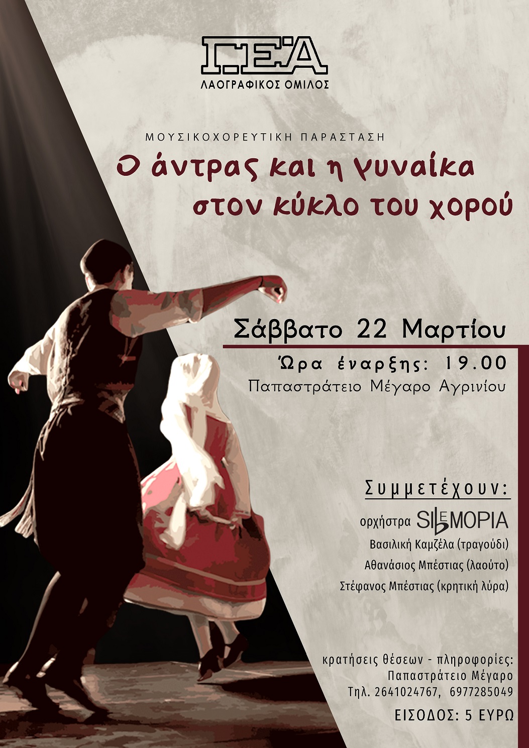 "Ο άνδρας και η γυναίκα στον κύκλο του χορού" είναι ο τίτλος της μεγάλης μουσικοχορευτικής παράστασης που διοργανώνεται από τον Λαογραφικό Όμιλο της Γυμναστικής Εταιρείας Αγρινίου (ΓΕΑ), το Σάββατο 22 Μαρτίου 2025 και ώρα 19:00, στο Παπαστράτειο Μέγαρο της Γυμναστικής Εταιρείας Αγρινίου.
