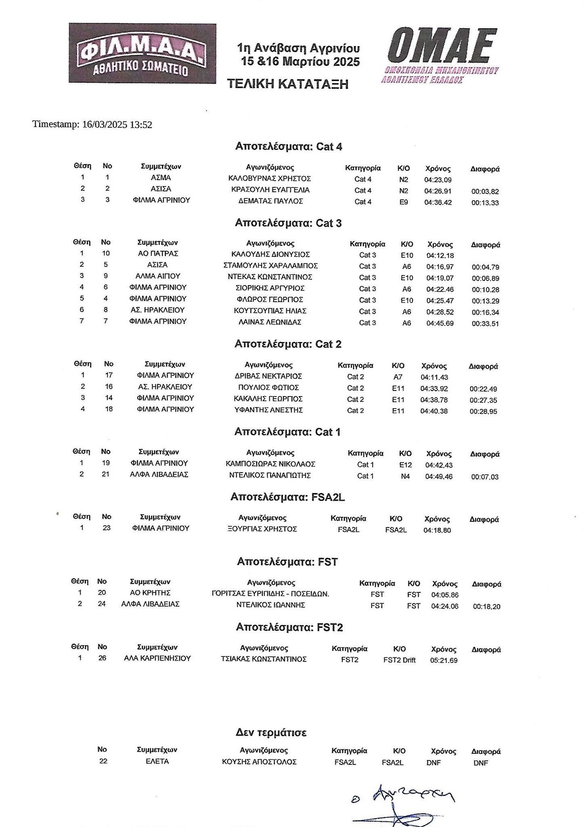 Σε ανακοίνωση της η ΦΙΛ.Μ.Α. Αγρινίου αναφέρει ότι, με αγωνιστική και οργανωτική επιτυχία διεξήχθη από την λέσχη το Σαββατοκύριακο 15 & 16 Μαρτίου 2025, η 1η Ανάβαση Αγρινίου.
