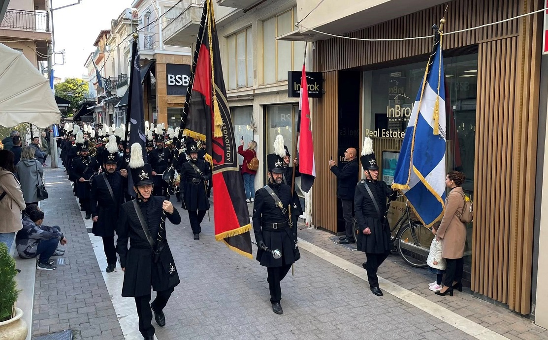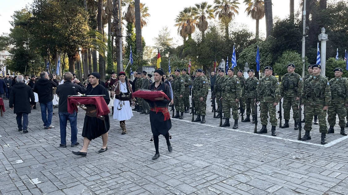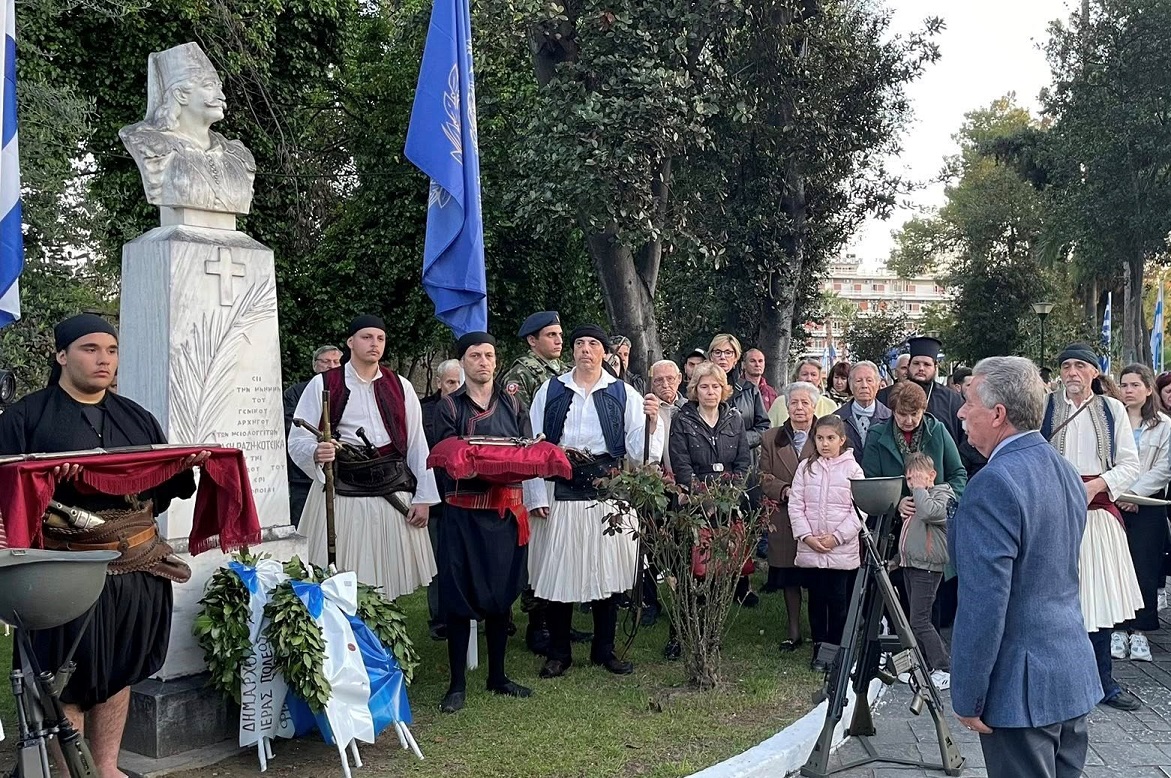 Στη συνέχεια, με παιανίζουσα την Φιλαρμονική «Διονύσιος Σολωμός» και άγημα του Ιστορικού Συλλόγου, σχηματίστηκε πομπή η οποία κατέληξε στον Κήπο των Ηρώων όπου, μπροστά από την προτομή του τιμώμενου ήρωα τελέσθηκε Επιμνημόσυνη Δέηση, από τον Σεβασμιώτατο Μητροπολίτη, κ. Δαμασκηνό, ενώ εκφωνήθηκαν ολιγόλεπτες ομιλίες από τον τον Δήμαρχο κ. Σπύρο Διαμαντόπουλο και τον εκπρόσωπο της Φιλαρμονικής «Διονύσιος Σολωμός», κ. Τάκη Φωλιά και κατόπιν έγινε κατάθεση στεφάνων.