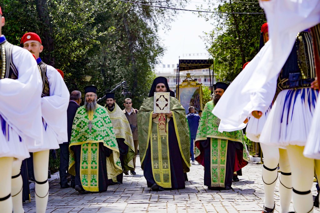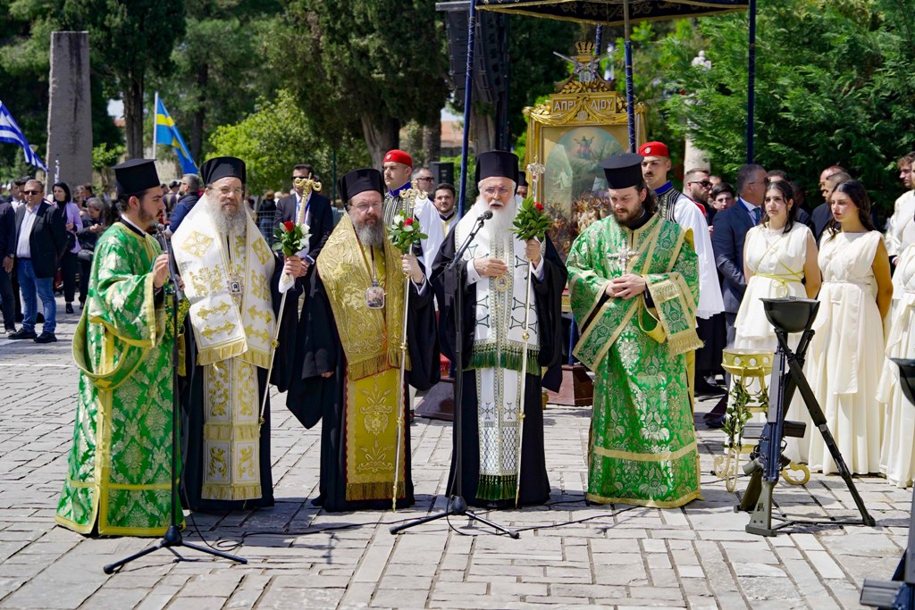 Με την ιερά λιτανεία μεταφέρθηκε η Εικόνα της Εξόδου, το Ιερό Λάβαρο και ο Σταυρός Ευλογίας του Επισκόπου Ρωγών Ιωσήφ στον Κήπο των Ηρώων της Ιεράς Πόλεως.