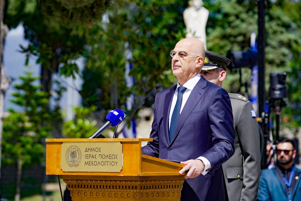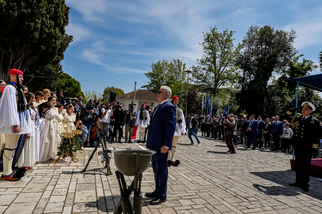 Ακολούθησαν η κατάθεση στεφάνου από τον Πρόεδρο της Ελληνικής Δημοκρατίας κ. Κωνσταντίνο Τασούλα και η εκφώνηση του πανηγυρικού της ημέρας από τον εκπρόσωπο της Ελληνικής Κυβερνήσεως, Υπουργό Εθνικής Άμυνας κ. Νίκο Δένδια, ενώ η υψίφωνος κα Βίβιαν Ντάγκλας απέδωσε το μοιρολόι «Να ζει το Μεσολόγγι».