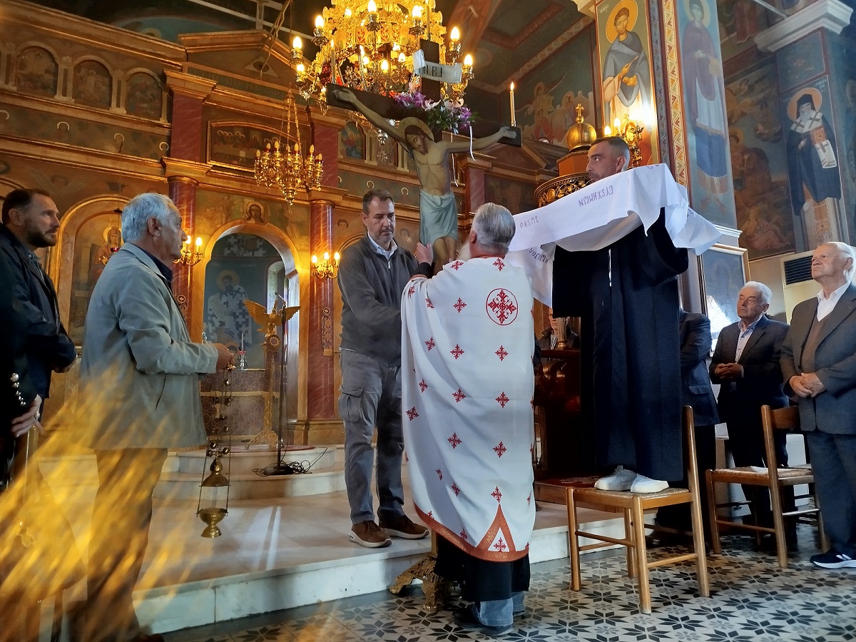 Ο Ιερέας φορώντας,λευκά άμφια, τη Μεγάλη Παρασκευή αποκαθηλώνει το Σώμα του Κυρίου από τον Σταυρό, τυλιγμένο με λευκό σεντόνι, και το εναποθέτει στο στολισμένο κουβούκλιο του επιταφίου, το οποίο έχει ήδη τοποθετηθεί στο κέντρο του Ναού.