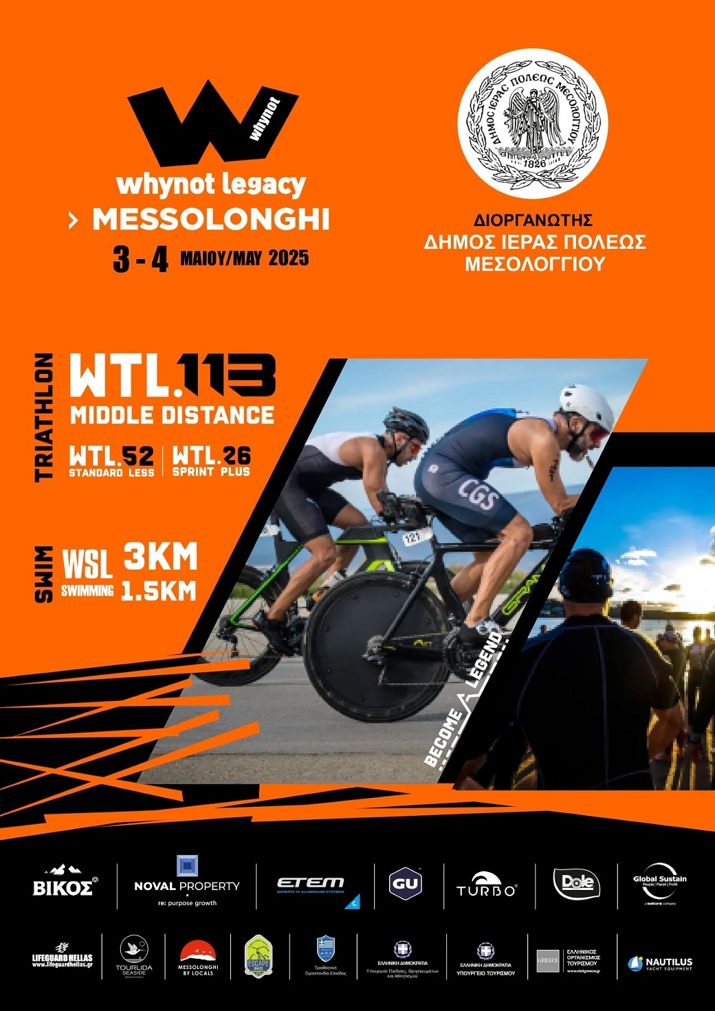 Ο Δήμος Ιερής Πόλης Μεσολογγίου, σε συνεργασία με την Εταιρεία Whynot, ανακοινώνει με χαρά τη διεξαγωγή του τριαθλητικού αγώνα WTL Messolonghi Legacy, που θα πραγματοποιηθεί το Σαββατοκύριακο 3 και 4 Μαΐου 2025.