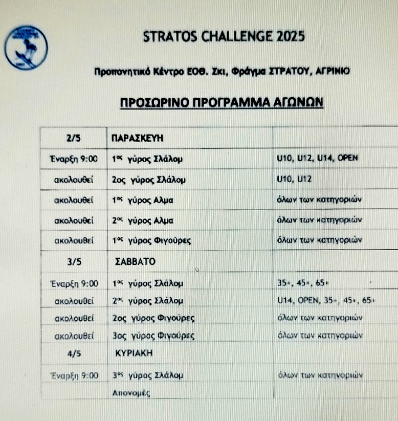 Η Ελληνική Ομοσπονδία Θαλάσσιου Σκι διοργανώνει τον πρώτο Διεθνή αγώνα τριάθλου της εφετινής χρονιάς, Stratos Challenge 2025, ο οποίος θα διεξαχθεί στο Φράγμα του Αχελώου στο Αγρίνιο από 2 έως 5 Μαΐου.