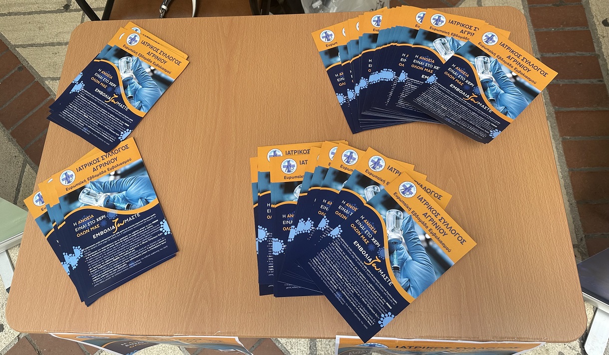 Ο Ιατρικός Σύλλογος Αγρινίου σε συνεργασία με τη Διεύθυνση Κοινωνικής Προστασίας και Δημόσιας Υγείας του Δήμου Αγρινίου πραγματοποίησε σήμερα, Παρασκευή 02 Μαΐου 2025, δράση ενημέρωσης και ευαισθητοποίησης των πολιτών για τη σημασία του εμβολιασμού ως βασικού πυλώνα προστασίας της δημόσιας υγείας, στο πλαίσιο της Ευρωπαϊκής Εβδομάδας Εμβολιασμού (24–30 Απριλίου), πρωτοβουλία του Παγκόσμιου Οργανισμού Υγείας (Π.Ο.Υ.).