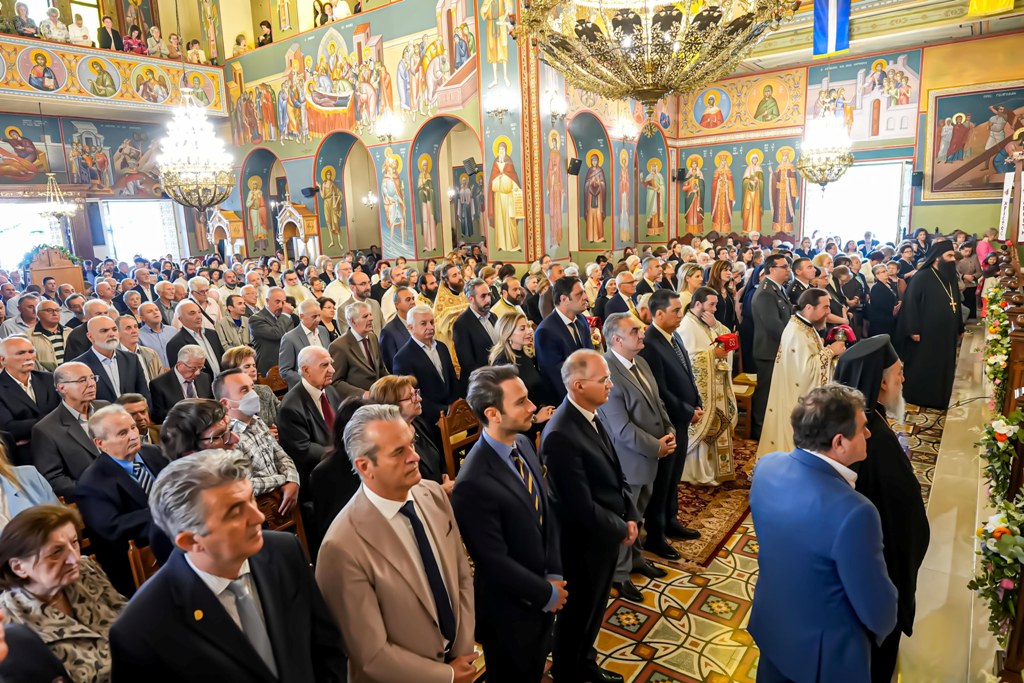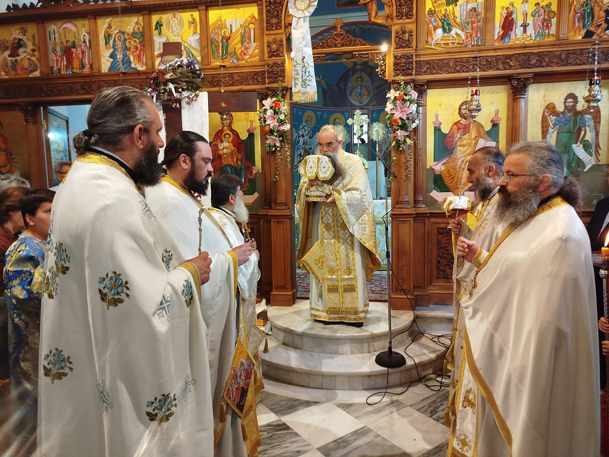 Στην ακολουθία του Όρθρου και στην πολυαρχιερατική Θεία Λειτουργία, που τελέσθηκαν στον νέο Ιερό Ναό του Αγίου Χριστοφόρου, προεξήρχε ο Μητροπολίτης Νέας Κρήνης και Καλαμαριάς κ. Ιουστίνος και συλλειτούργησαν οι Μητροπολίτες Πολυανής και Κιλκισίου κ. Βαρθολομαίος, Φλωρίνης, Πρεσπών και Εορδαίας κ. Ειρηναίος και Αιτωλίας και Ακαρνανίας κ. Δαμασκηνός.