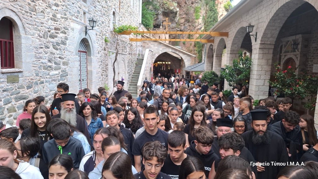 Στο τέλος της Παρακλήσεως, ο Ηγούμενος της Μονής, Γέροντας Ιωαννίκιος καλωσόρισε τα κατηχητικά σχολεία και εξέφρασε τη χαρά του για την παρουσία των παιδιών. Αναφέρθηκε σύντομα στο ιστορικό της Ιεράς Εικόνος, εστιάζοντας στο μεγάλο θαύμα που επετέλεσε η Υπεραγία Θεοτόκος στην πόλη του Αγρινίου κυρίως, αλλά και σε ολόκληρη την περιοχή της Αιτωλοακαρνανίας το έτος 1918, όπου υφίστατο η πανδημία της Ισπανικής Γρίπης. Έδειξε δε στα παιδιά το πολυκάντηλο, το οποίο αφιέρωσαν οι κάτοικοι του Αγρινίου στην Ιερά Μονή σε ένδειξη ευγνωμοσύνης προς την Παναγία μας.