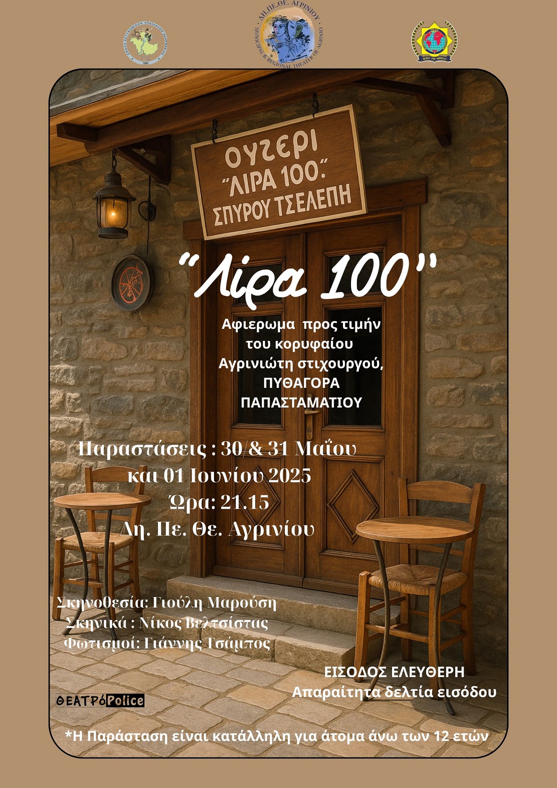 Το Δη.Πε.Θε. Αγρινίου και η ερασιτεχνική θεατρική ομάδα ΘΕΑΤΡόPolice της Ένωσης Αστυνομικών Υπαλλήλων Ακαρνανίας και της Τοπικής Διοίκησης Ακαρνανίας της Διεθνούς Ένωσης Αστυνομικών συνεργάζονται για ενδέκατη συνεχόμενη χρονιά παρουσιάζοντας την Μουσικοθεατρική παράσταση με τίτλο: «ΛΙΡΑ… 100» σε σκηνοθεσία της Γιούλης Μαρούση.