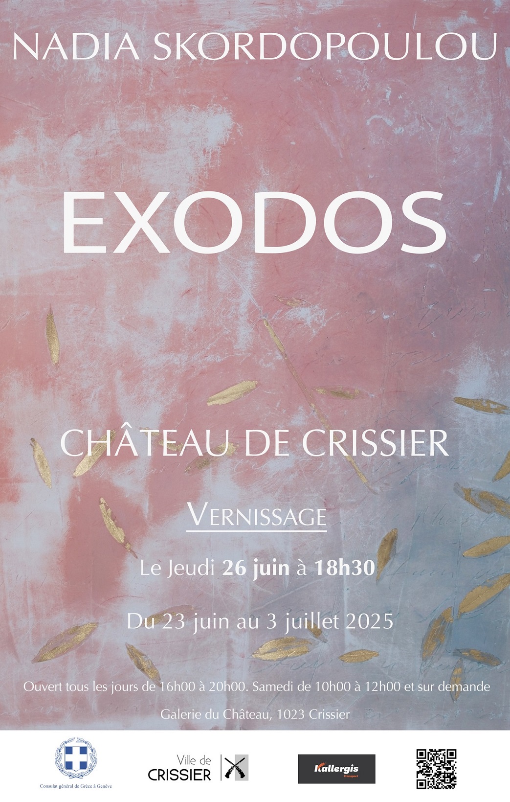Η Αγρινιώτισσα καλλιτέχνης Νάντια Σκορδοπούλου, με αφορμή τα 200 χρόνια από την Έξοδο, παρουσιάζει μια σειρά από έργα της που συνδέονται με την ιστορία του Μεσολογγίου, μέσα από την έκθεση « EXODOS » που θα πραγματοποιηθεί στην Ελβετία, υπό την αιγίδα του Ελληνικού Γενικού Προξενείου Γενεύης, στο ιστορικό Château de Crissier από τις 23 Ιουνίου έως τις 3 Ιουλίου 2025.
