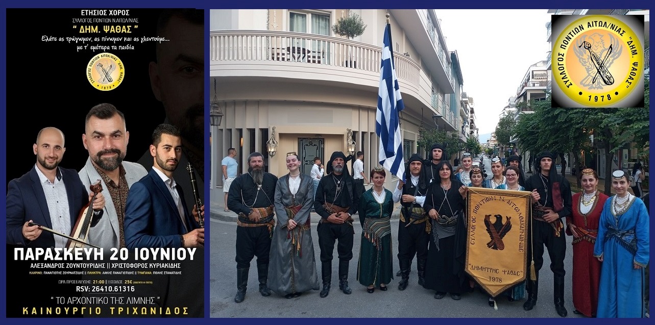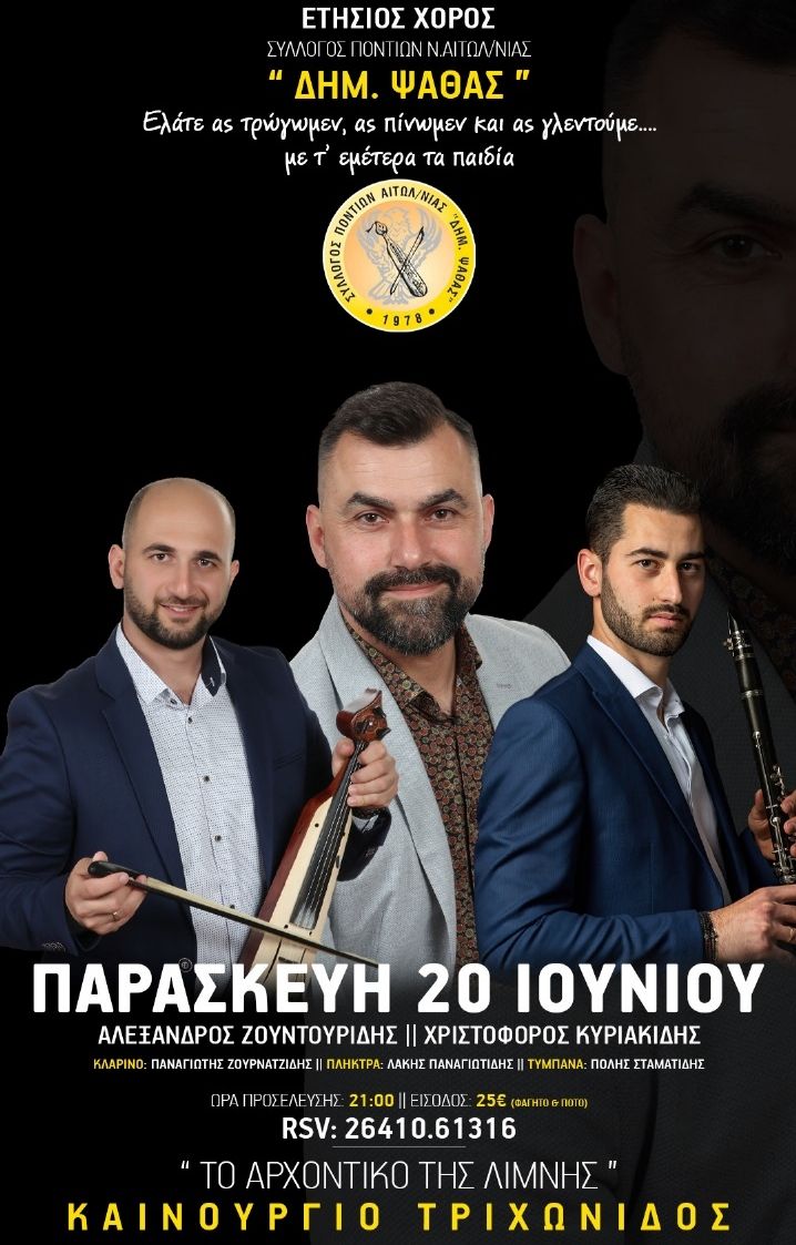 Η καρδιά των Ποντίων της Αιτωλοακαρνανίας χτυπά αυτή την Παρασκευή 20 Ιουνίου 2025, στις 9 το βράδυ, στο Κέντρο "Αρχοντικό της Λίμνης" στο Καινούργιο Τριχωνίδας. Ο Σύλλογος Ποντίων Ν. Αιτωλοακαρνανίας Δ. Ψαθάς σας περιμένει όλους, Πόντιους και μη, για να περάσετε μια υπέροχη βραδιά με τον Αλέξανδρο Ζουντουρίδη και το Χριστόφορο Κυριακίδη!