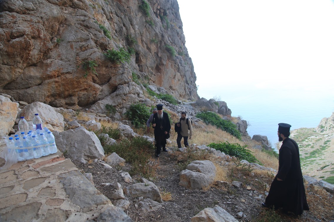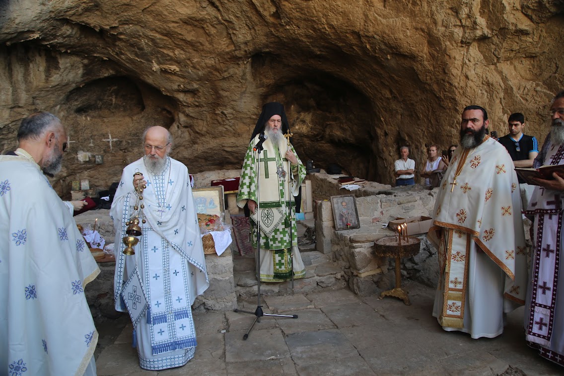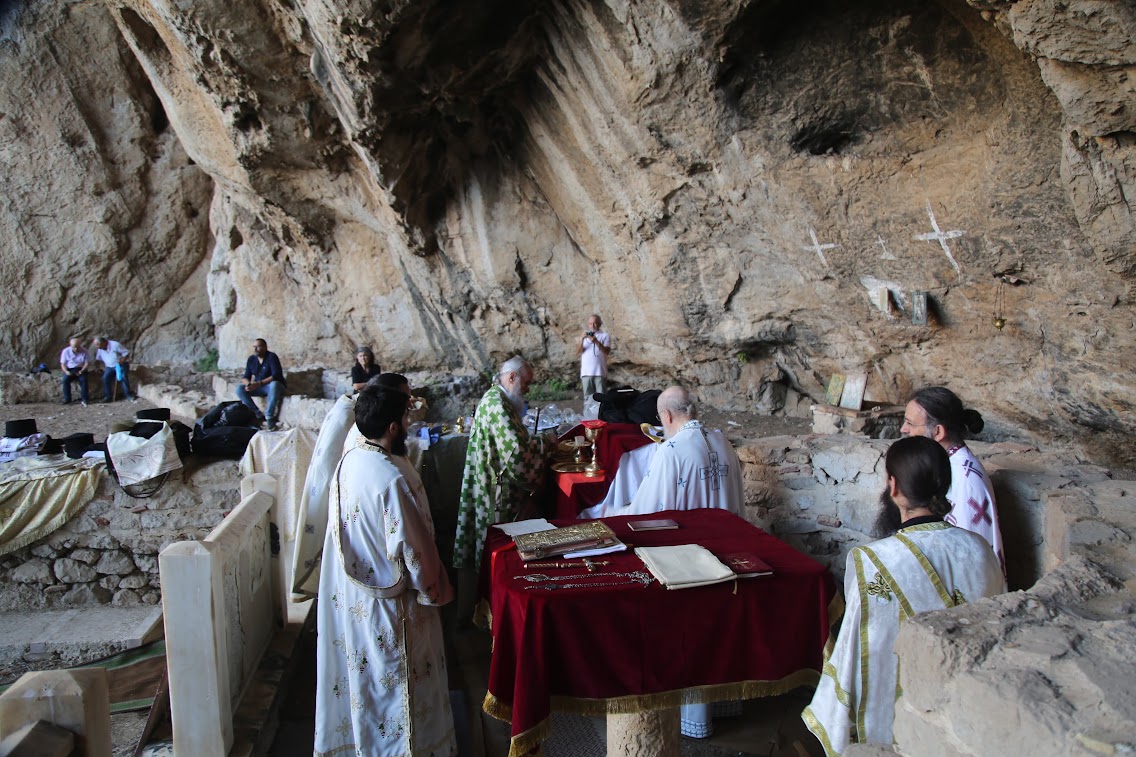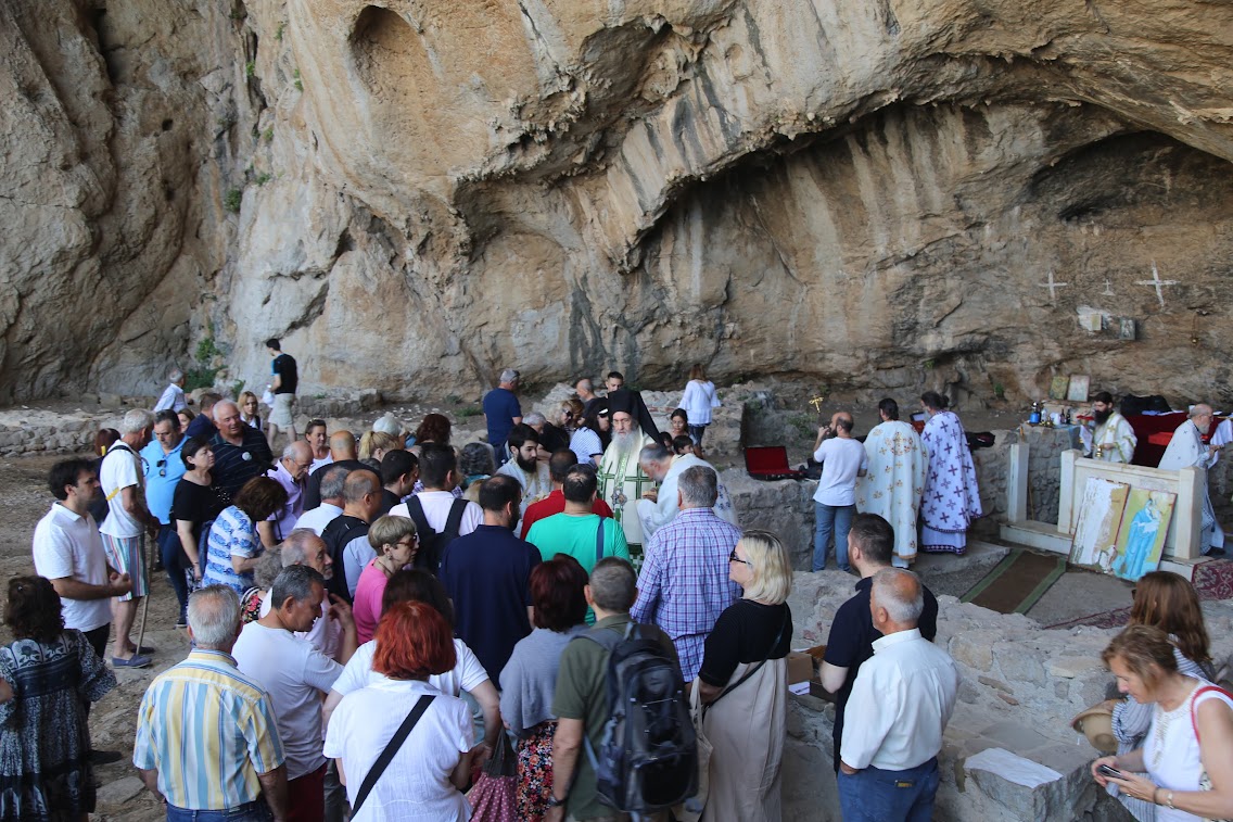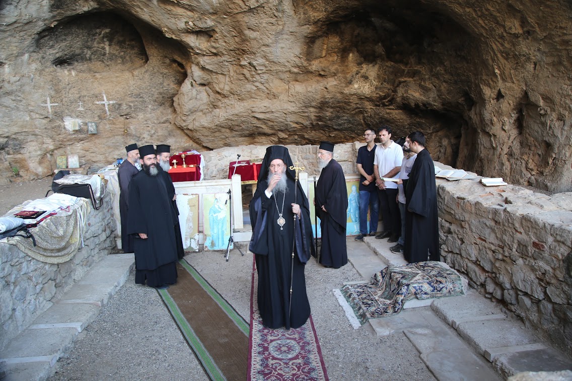 Μετά την θεία Λειτουργία ευχαρίστησε όλους όσοι βοήθησαν για να τελεσθή η θεία Λειτουργία στο Σπήλαιο, τους Ιερείς και Διακόνους που λειτούργησαν, ιδιαιτέρως τον π. Ιωάννη Βλάχο, Εφημέριο της Κάτω Βασιλικής και τους ανθρώπους που μετέφεραν τον κόσμο με τα καΐκια τους, τους ιεροψάλτες, την κ. Ιωάννα Σερμιτζέλη, κινητήρια δύναμη της πανηγύρεως, και όλους όσοι ανέβηκαν για να εκκλησιασθούν. Επίσης, ευχήθηκε να είναι αιωνία η μνήμη των ασκητών που εμόνασαν στο μέρος αυτό και του Αθανασίου Παλιούρα, καθηγητού, που με τους συνεργάτες του ανέσκαψαν το Σπήλαιο.
