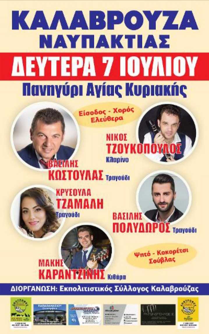 Ο Εκπολιτιστικός Σύλλογος Καλαβρούζας διοργανώνει και τη φετινή χρονιά το πανηγύρι της Αγίας Κυριακής, που έγινε θεσμός! Την Δευτέρα 7 Ιουλίου όλοι οι δρόμοι οδηγούν στην Καλαβρούζα Ναυπακτίας!