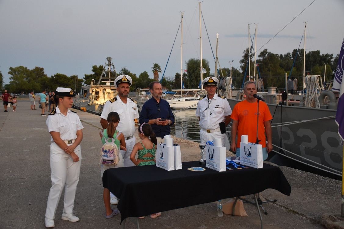 Οι νικητές του αγώνα σε ομαδική φωτογράφιση με τους εκπροσώπους του Πολεμικού Ναυτικού, Υποπλοίαρχο, Άγγελος Μπουρνάζο, τους Πλωτάρχες Θανάση Κατσαβό και Γιώργο Παπαγεωργίου, τον Αντιδήμαρχο της Ιερής Πόλης Σωτήρη Φαράντο, την Πρόεδρο του Λιμενικού Ταμείου Μεσολογγίου, Νεκταρία Αλετρά και τους πανταχού παρόντες εθελοντές ερυθροσταυρίτες της πόλης.