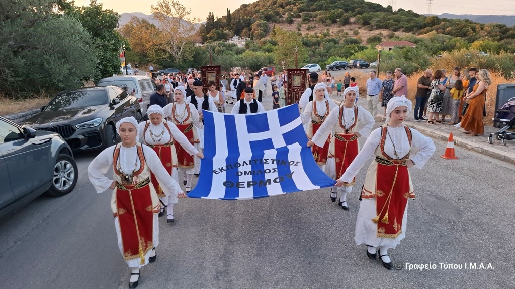 Ακολούθησαν στην κεντρική πλατεία της κοινότητας οι χαιρετισμοί των επισήμων και πολιτιστική βραδιά από τα μέλη του Εκπολιτιστικού Ομίλου Θέρμου.