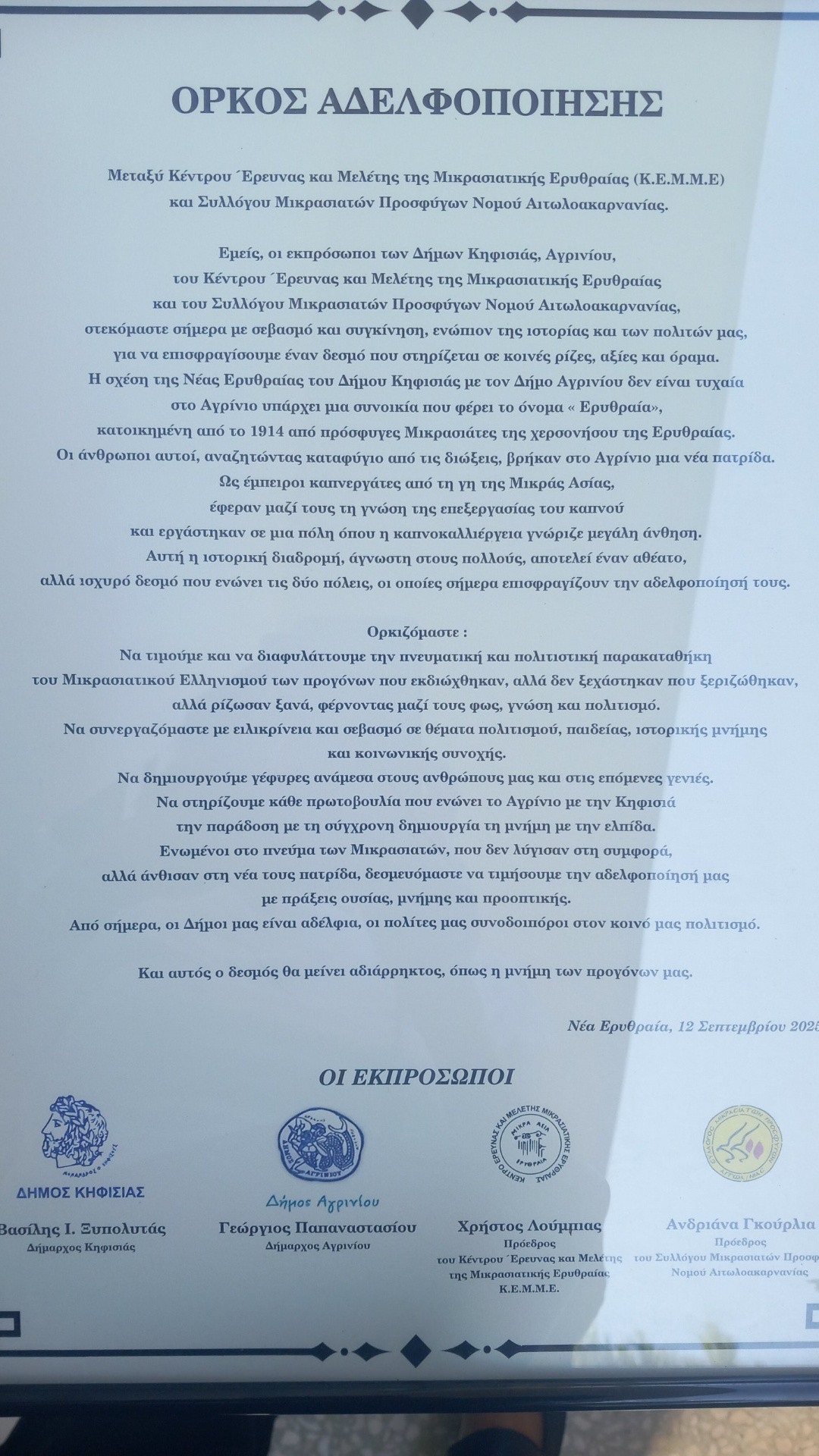 Η εκδήλωση πραγματοποιήθηκε την Παρασκευή 12 Σεπτεμβρίου 2025 στο Δημοτικό Θέατρο Ν. Ερυθραίας, με τη συμμετοχή εκπροσώπων της τοπικής αυτοδιοίκησης, πολιτιστικών συλλόγων, ιστορικών και πλήθους κόσμου. Εκ μέρους του Δήμου Αγρινίου, ο Δήμαρχος απηύθυνε θερμό χαιρετισμό, τονίζοντας τη σημασία της προσφυγικής ιστορίας και τη δύναμη των ανθρώπων που μεταμόρφωσαν τη δοκιμασία της προσφυγιάς σε δημιουργία και πρόοδο.