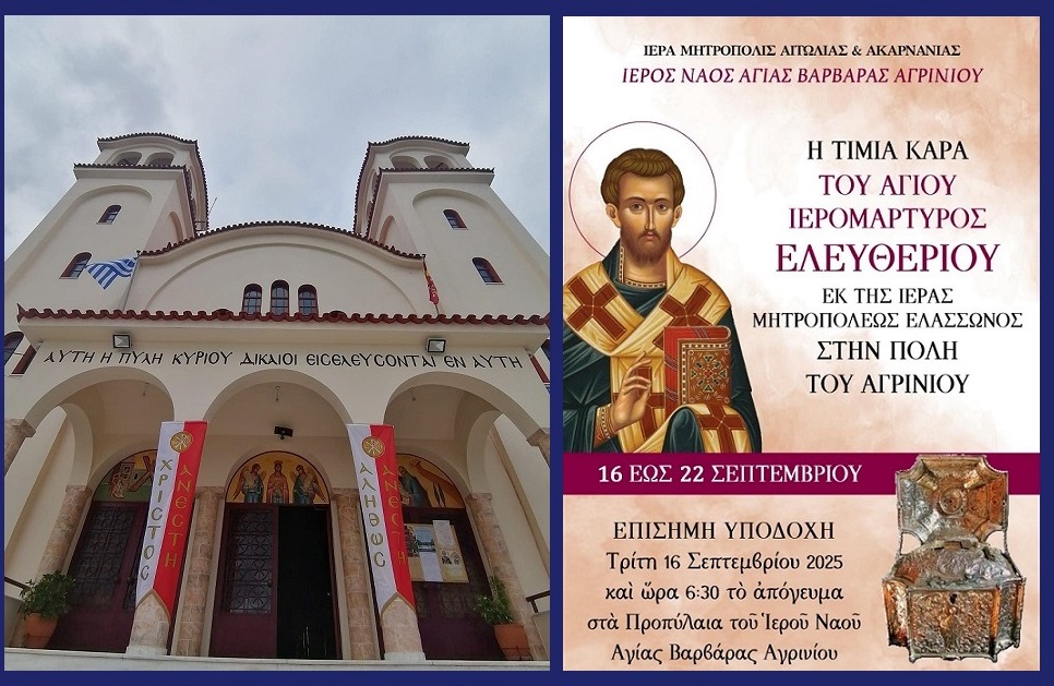 Την Τιμία Κάρα του Αγίου ενδόξου Ιερομάρτυρος Ελευθερίου θα υποδεχθεί η Ενορία της Αγίας Βαρβάρας Αγρινίου, την Τρίτη 16 Σεπτεμβρίου 2025 και ώρα 6:30’ το απόγευμα.