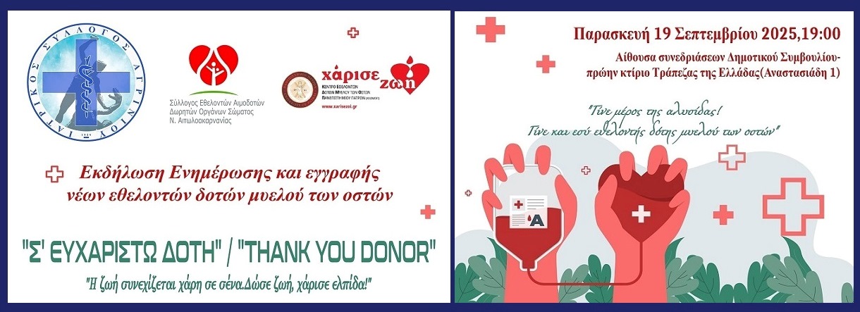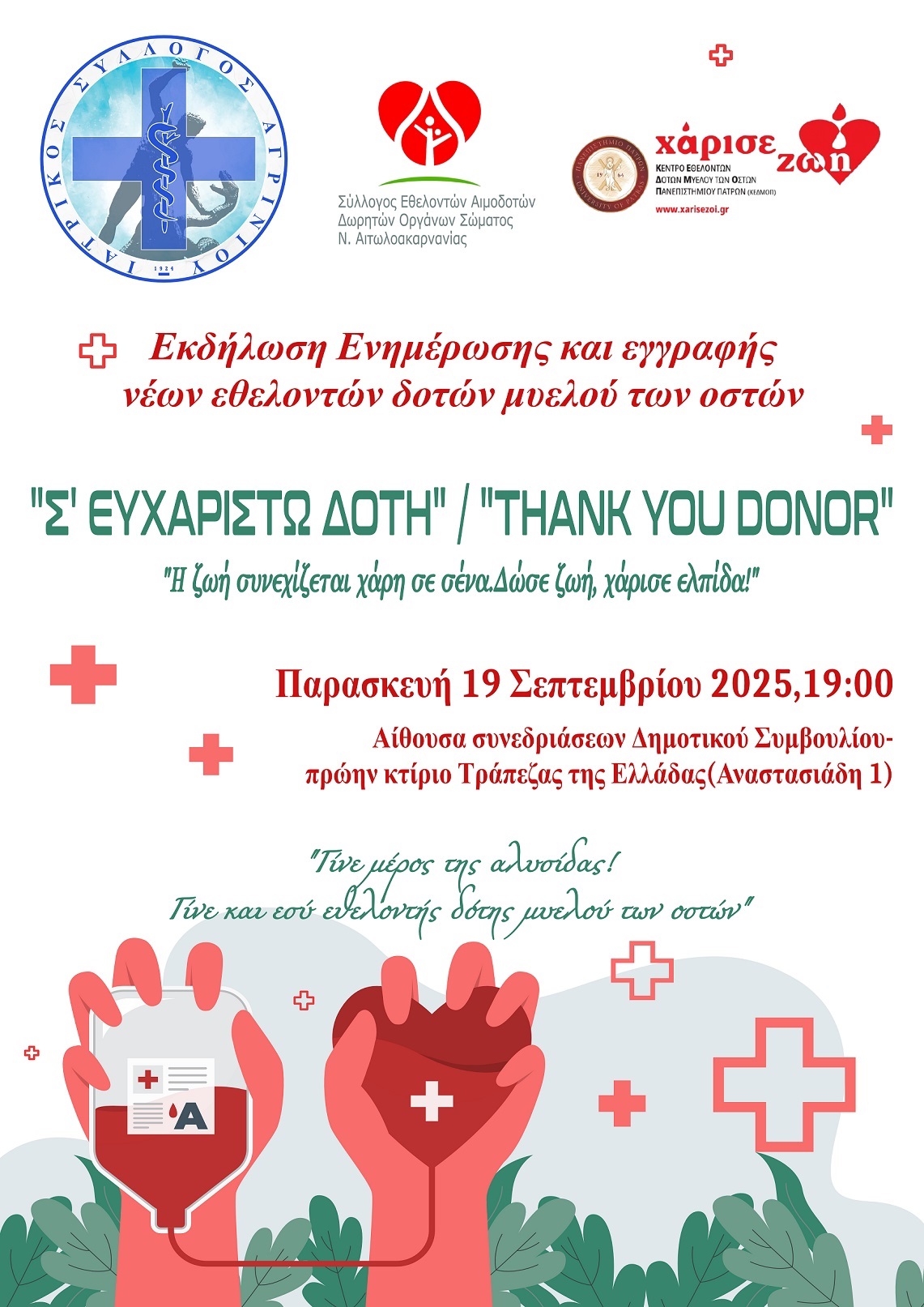 Εκδήλωση με τίτλο «Σ’ Ευχαριστώ Δότη - Thank you Donor» με επίκεντρο τη δύναμη της προσφοράς και την αξία της δωρεάς μυελού των οστών, θα πραγματοποιηθεί στο Αγρίνιο, την Παρασκευή 19 Σεπτεμβρίου 2025 και ώρα 19:00 στην Αίθουσα συνεδριάσεων Δημοτικού Συμβουλίου - πρώην κτίριο Τράπεζας της Ελλάδας (Αναστασιάδη 1).