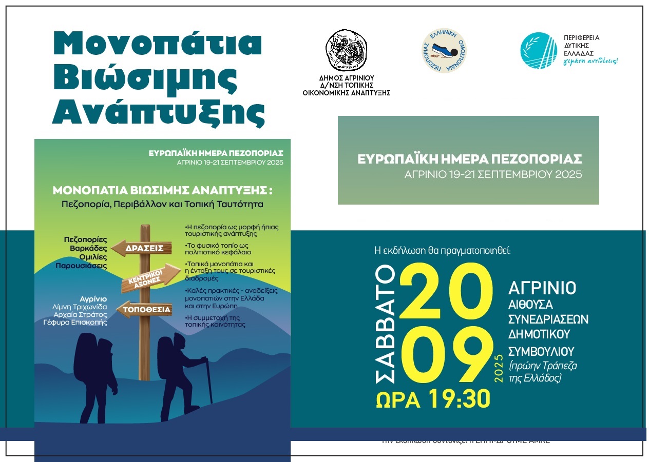 Ο Δήμος Αγρινίου, σε συνεργασία με την Ελληνική Ομοσπονδία Πεζοπορίας, την Περιφέρεια Δυτικής Ελλάδας, εθελοντικές οργανώσεις και ενεργούς πολίτες, διοργανώνει ένα πλούσιο πρόγραμμα εκδηλώσεων και δράσεων με αφορμή την Ευρωπαϊκή Ημέρα Πεζοπορίας, που θα πραγματοποιηθεί από την Παρασκευή 19 έως και την Κυριακή 21 Σεπτεμβρίου 2025.