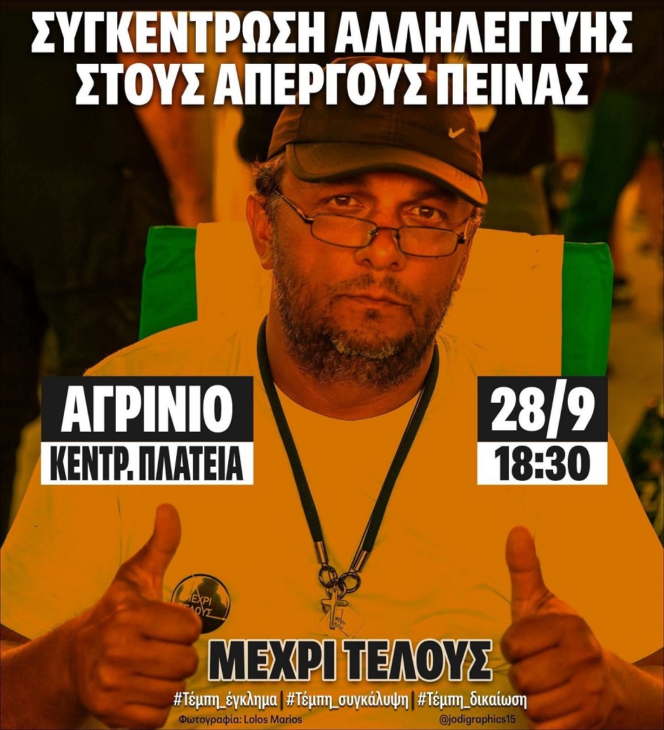 Συγκέντρωση αλληλεγγύης στον απεργό πείνας Πάνο Ρούτσι, τον πατέρα του 22χρονου Ντένις που σκοτώθηκε στο σιδηροδρομικό δυστύχημα των Τεμπών, έχει προγραμματιστεί να πραγματοποιηθεί την Κυριακή 28 Σεπτεμβρίου στις 18:30 μ.μ. στην πλατεία Δημοκρατίας, στο Αγρίνιο.