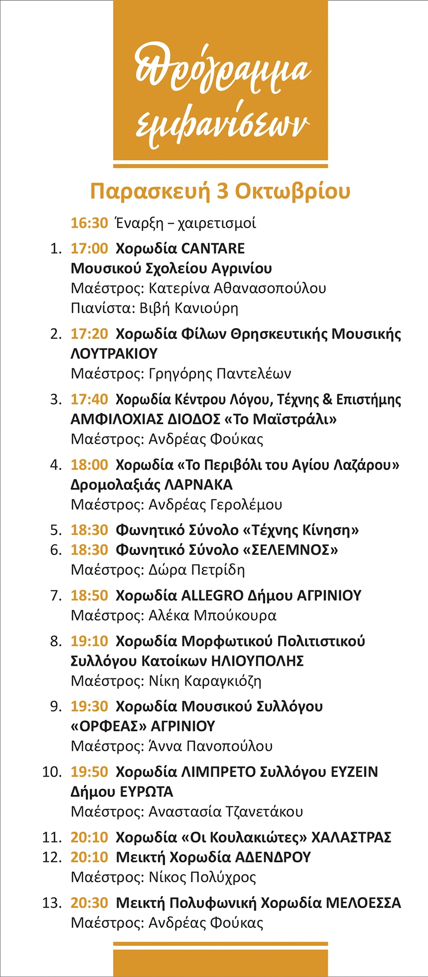 Καλούμε το εκλεκτό κοινό της πόλης και του νομού μας να δώσει δυναμικό παρών και να μοιραστεί μαζί μας τη συγκίνηση, τη χαρά και την έμπνευση που προσφέρει η χορωδιακή μουσική.