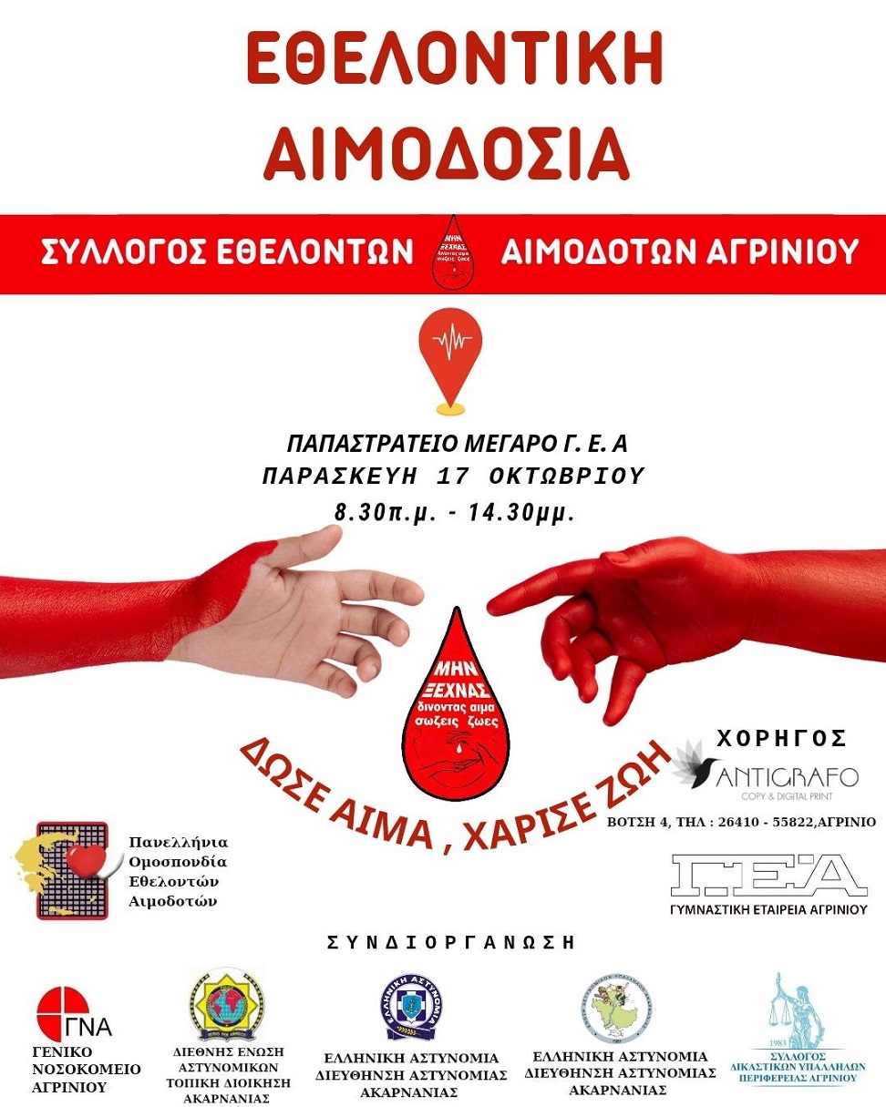 • Την Παρασκευή 17/10 θα πραγματοποιηθεί εθελοντική αιμοδοσία στο Παπαστράτειο μέγαρο της Γυμναστικής Εταιρίας Αγρινίου από 08:00 έως 14:00. Επειδή όλοι μας ενδέχεται να χρειαστούμε κάποια στιγμή στην ζωή μας αίμα, είτε για εμάς τους ιδίους είτε για συγγενικά μας πρόσωπα, καλό είναι να έχουμε προνοήσει δίνοντας αίμα εκ των προτέρων για να μην ψάχνουμε και παρακαλούμε κανέναν την τελευταία στιγμή.