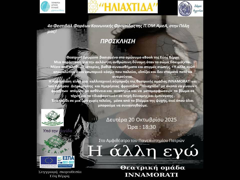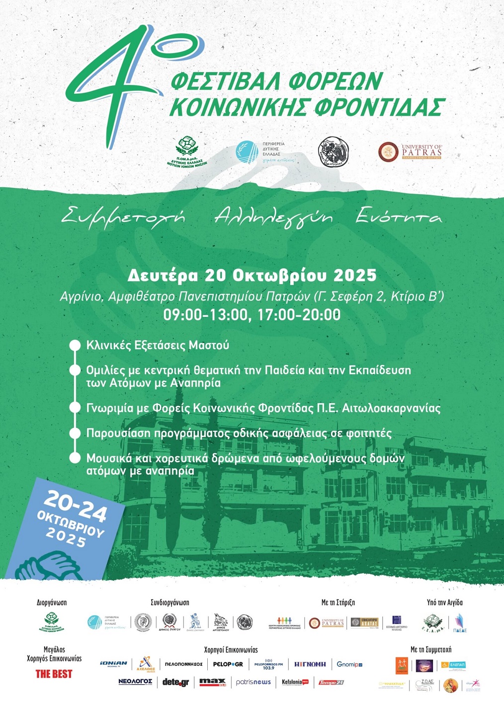 Με πρώτο σταθμό το Αγρίνιο, στο κτίριο Β’ του Πανεπιστημίου Πατρών (Γ. Σεφέρη 2) ξεκινά τη Δευτέρα 20 Οκτωβρίου 2025, το 4ο Φεστιβάλ Φορέων Κοινωνικής Φροντίδας, της Περιφερειακής Ομοσπονδίας Ατόμων με Αναπηρία Δυτικής Ελλάδας και Νοτίων Ιονίων Νήσων.