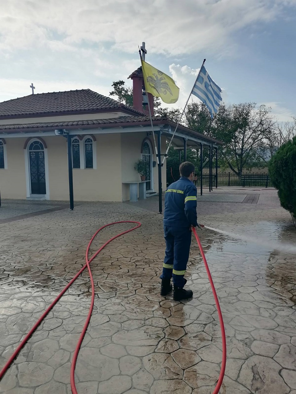 Ένα όχημα και τρεις άνδρες της Πυροσβεστικής Υπηρεσίας Αγρινίου πραγματοποίησαν σήμερα καθαριότητες στον προαύλιο χώρο του εξωκλησιού του Αγίου Δημητρίου στον Πλάτανο Καλυβίων.