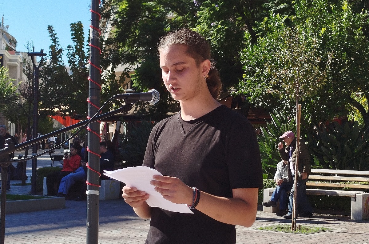 Όλοι μαζί κόντρα στο σάπιο σύστημα τους, όλοι μαζί απέναντι στην πολιτική που τσακίζει τις ζωές μας! Θα Κερδίσουμε!¨» κατέληξε η ομιλία του μαθητή Φώτη Τσούνη.