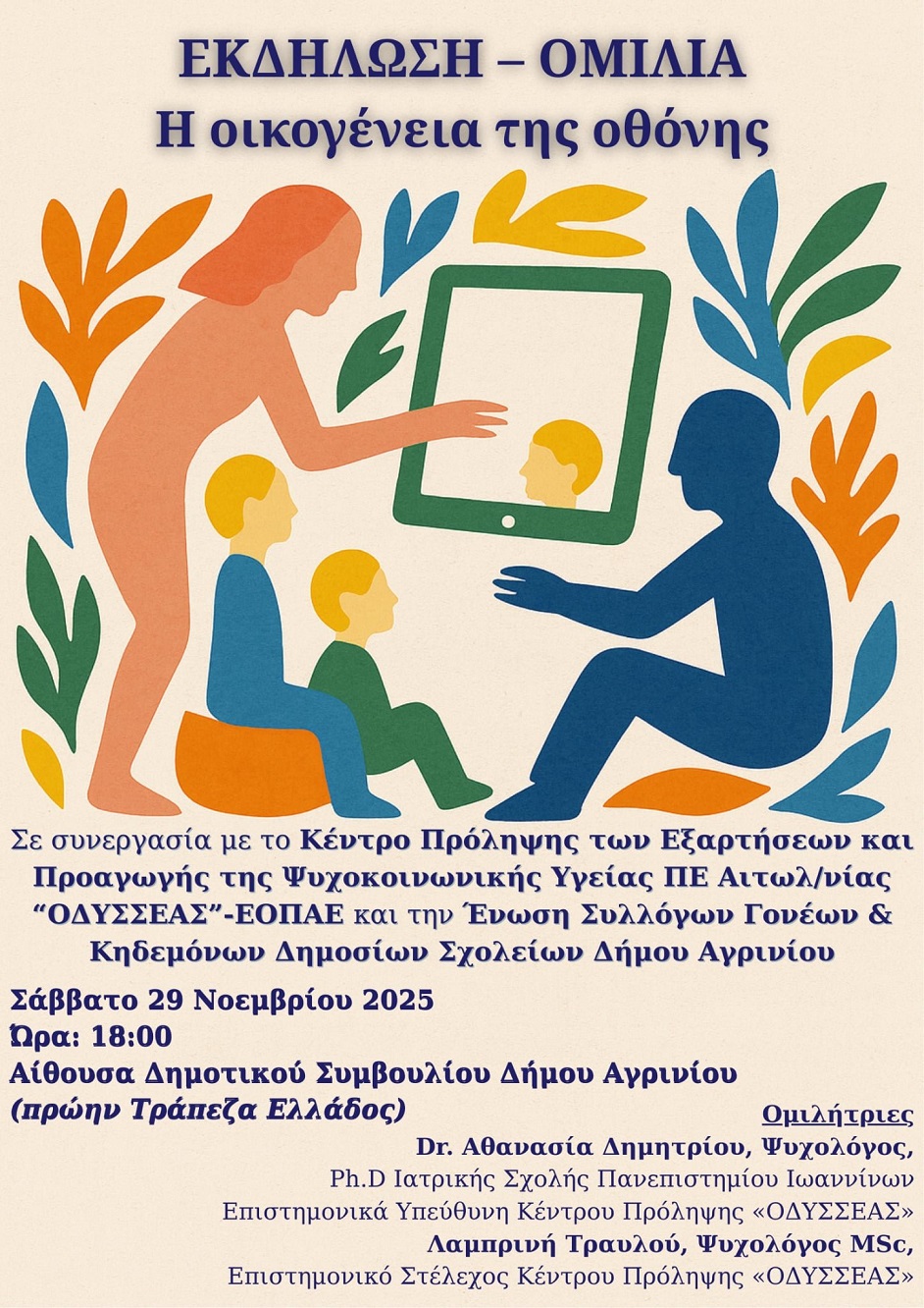Η Ένωση Συλλόγων Γονέων & Κηδεμόνων Δημοσίων Σχολείων Δήμου Αγρινίου, σε συνεργασία με το Κέντρο Πρόληψης των Εξαρτήσεων και Προαγωγής της Ψυχοκοινωνικής Υγείας Π.Ε. Αιτωλ/νίας « Οδυσσέας» - ΕΟΠΑΕ, σας προσκαλεί στην ενημερωτική εκδήλωση: «Η οικογένεια της οθόνης» που θα πραγματοποιηθεί το Σάββατο 29 Νοεμβρίου 2025 και ώρα 18:00, στην Αίθουσα Δημοτικού Συμβουλίου Δήμου Αγρινίου (πρώην Τράπεζα Ελλάδος).