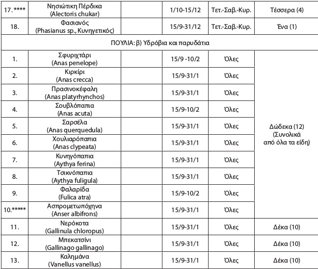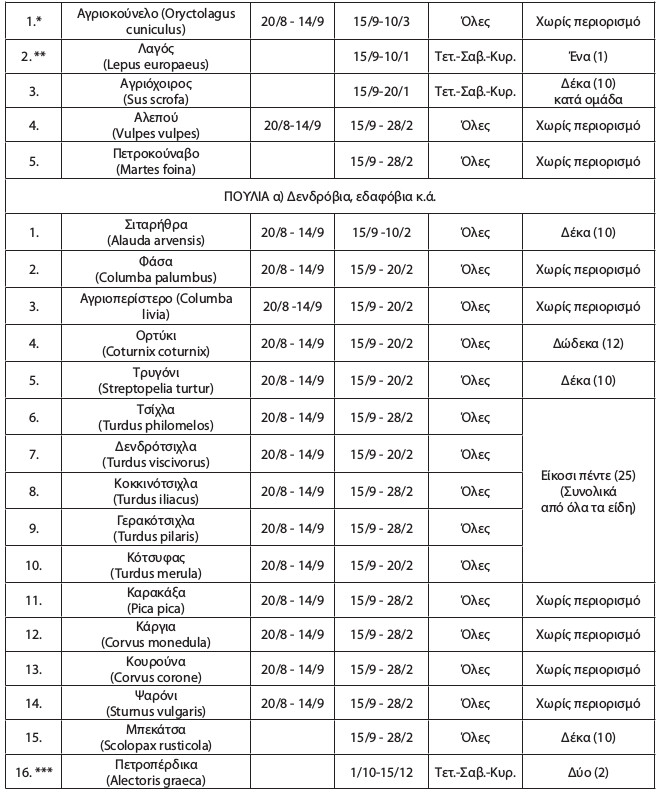 Τα επιτρεπόμενα να κυνηγηθούν είδη, η χρονική περίοδος και οι μέρες κυνηγίου τους, καθώς και ο μέγιστος αριθμός θηραμάτων κατά είδος, που επιτρέπεται να θηρεύει ο κάθε κυνηγός στην ημερήσια έξοδό του καθορίζονται ως εξής: