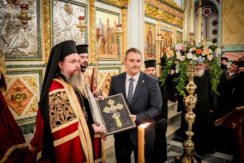 Ο Σεβασμιώτατος Μητροπολίτης Αιτωλίας και Ακαρνανίας αμέσως μετά, απένειμε την Ανώτατη Τιμητική Διάκριση της Ιεράς Μητροπόλεως Αιτωλίας και Ακαρνανίας, ήτοι τον Χρυσούν Σταυρόν μετά Μεταλλίου, στον Εντιμώτατο κ. Νεκτάριο Φαρμάκη, Περιφερειάρχη Δυτικής Ελλάδας για την μεγάλη και πολλαπλή συμβολή του στην ανακαίνιση του Ιερού Μητροπολιτικού Ναού.