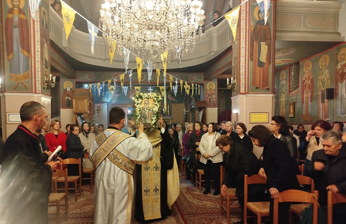 Στον Ι.Ν. Αγίου Νικολάου, χοροστατούντος του Πρωτοσύγγελου της Ιεράς Μητροπόλεως π. Θεόκλητου Ράπτη και του εφημέριου π. Θεοδόσιου Αθανασόπουλου, εψάλη ο Μέγας Πανηγυρικός Εσπερινός μετ’ αρτοκλασίας, ενώ ακούστηκε στη συνέχεια το κήρυγμα της ημέρας.