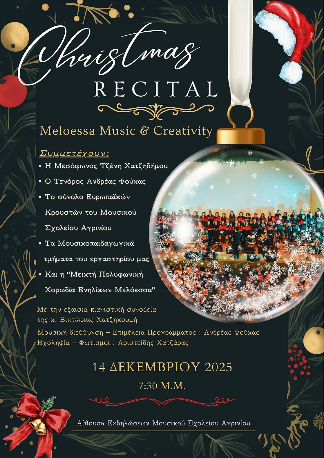 Το Μουσικό Εργαστήρι Meloessa II – Music and Creativity σας προσκαλεί στο Χριστουγεννιάτικο Ρεσιτάλ του, το οποίο θα πραγματοποιηθεί την Κυριακή 14 Δεκεμβρίου 2025, στις 19:30 μ.μ. στην Αίθουσα Εκδηλώσεων του Μουσικού Σχολείου Αγρινίου.