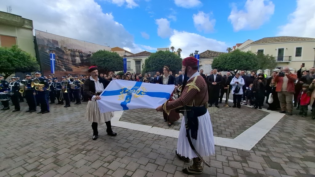 Ακολούθως, άπαντες εξήλθαν του Ιερού Μητροπολιτικού Ναού και στον προαύλιο χώρο έμπροσθεν του Ναού πραγματοποιήθηκε η επίσημη έπαρση της επετειακής σημαίας. Τις προβλεπόμενες τιμές και τον εθνικό ύμνο παιάνισε η Φιλαρμονική του Δήμου Ιεράς Πόλεως Μεσολογγίου «Διονύσιος Σολωμός».