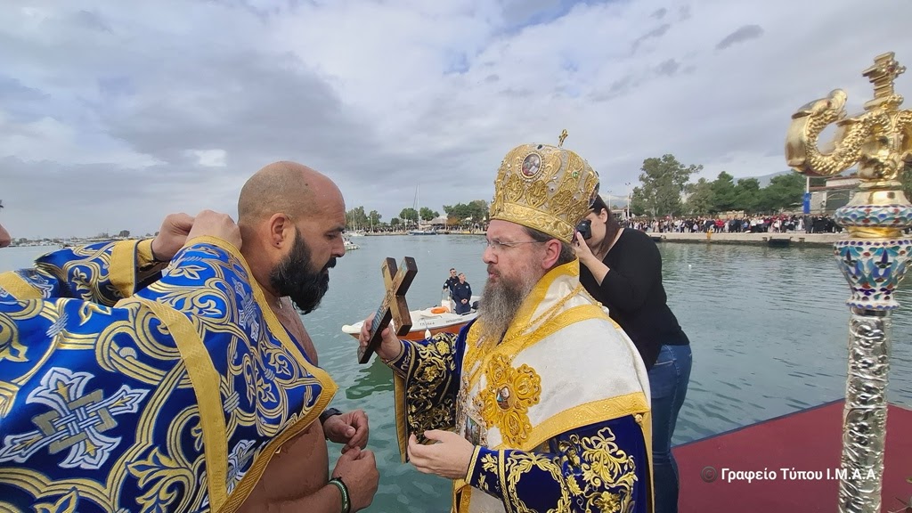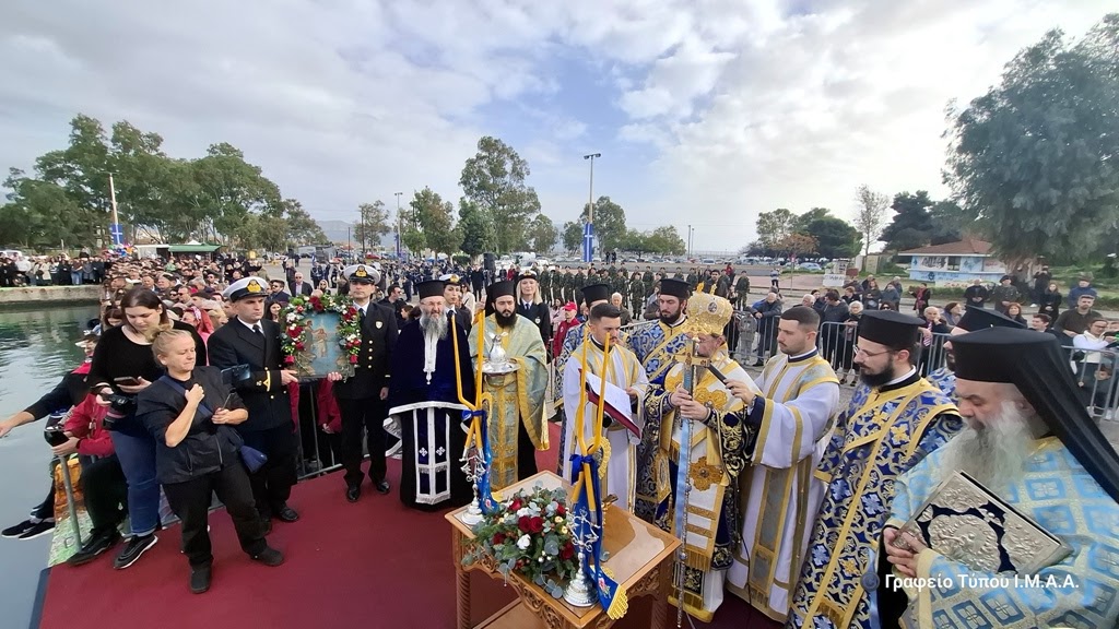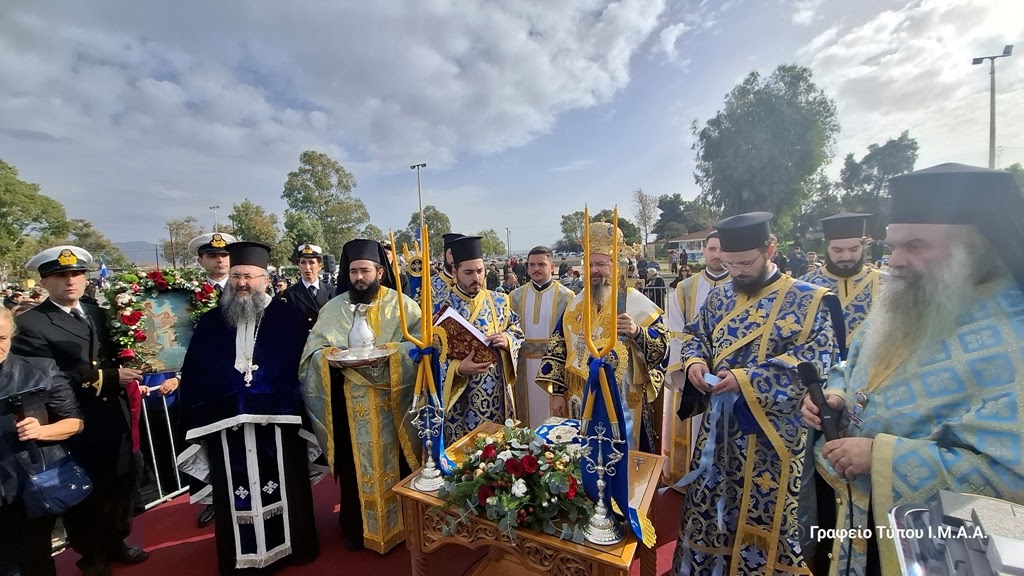 Αμέσως μετά τη Θεία Λειτουργία, ο Σεβασμιώτατος τέλεσε την Ακολουθία του Μεγάλου Αγιασμού εντός του Ναού και στη συνέχεια, με λιτανευτική πομπή, άπαντες κατευθύνθηκαν στο Λιμάνι της Ιεράς Πόλεως, όπου πραγματοποιήθηκε η Τελετή Κατάδυσης του Τιμίου Σταυρού και ο Αγιασμός των Υδάτων.