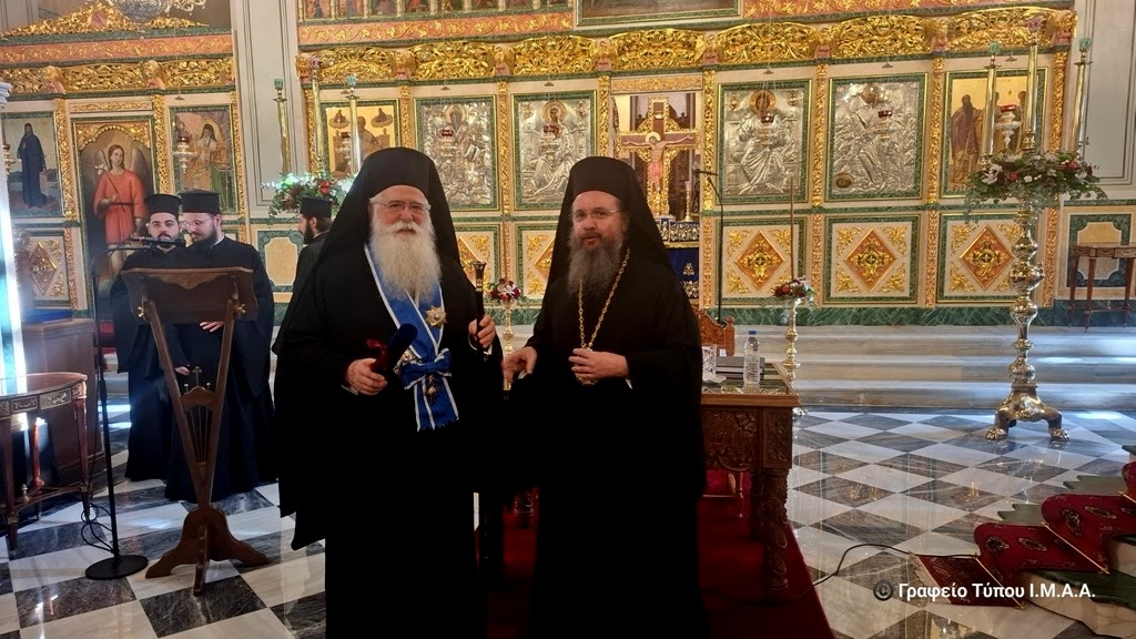 Ο Σεβασμιώτατος στη συνέχεια απένειμε στον σεπτό Γέροντά του, Μητροπολίτη Δημητριάδος και Αλμυρού κ. Ιγνάτιο, την Ανώτατη Τιμητική Διάκριση της Ιεράς Μητροπόλεως Αιτωλίας και Ακαρνανίας, ήτοι τον Χρυσούν Σταυρόν μετά Μεταλλίου. Συγκινημένος, αναφέρθηκε στο πρόσωπο και την εκκλησιαστική προσφορά του Μητροπολίτου Ιγνατίου, τονίζοντας ότι διακρίνεται για την ταπείνωση, την εργατικότητα, τα άπειρα αποθέματα αγάπης και συγχωρητικότητας προς όλους, την αφοσίωσή του στην Εκκλησία και στο έργο του Θεού, την προσήλωσή του στις ευαγγελικές επιταγές και την διδασκαλία των Αγίων Πατέρων. «Κοντά του έζησα το διαρκώς θυσιαζόμενο πνεύμα της κένωσης και της προσφοράς από όρθρου βαθέος έως φυλακής νυκτός και διδάχθηκα ότι η Εκκλησία πρέπει να είναι ανοικτή, δυνατή και ζωντανή, έτοιμη να υποδεχθεί τον κάθε άνθρωπο και φροντίζοντας στο πρόσωπό του την ζωντανή εικόνα του Θεού» ανέφερε μεταξύ άλλων και τον ευχαρίστησε για όσα έζησε και διδάχθηκε πλησίον του.