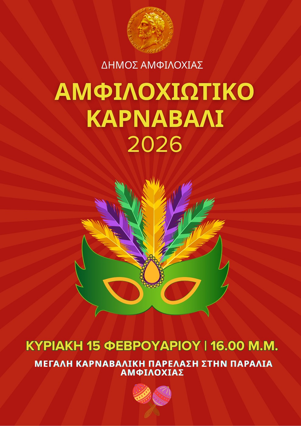 – 16:00 μ.μ. Αμφιλοχιώτικο Καρναβάλι: Μεγάλη καρναβαλική παρέλαση στην παραλιακή οδό (Νικολάου Στράτου) της Αμφιλοχίας με συμμετοχή γκρουπ από όλη τη Δυτική Ελλάδα