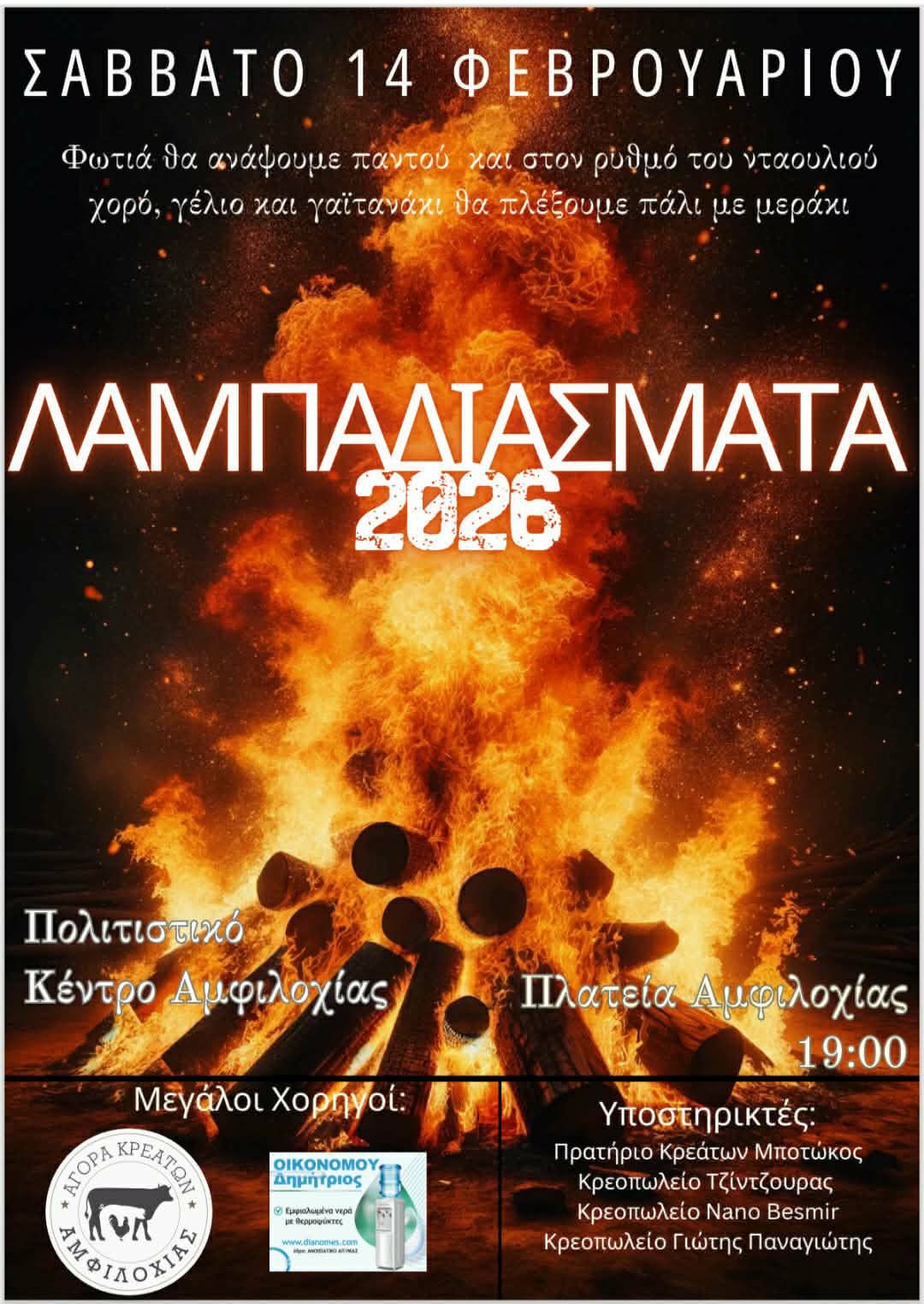 – 20:00 μ.μ. «Λαμπαδιάσματα» στην Κεντρική Πλατεία Αμφιλοχίας, παραδοσιακό γλέντι γύρω από τη φωτιά με ζωντανή παραδοσιακή μουσική και αναβίωση εθίμων