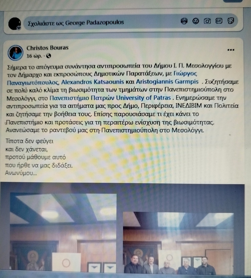 «Σήμερα το απόγευμα συνάντησα αντιπροσωπεία του Δήμου Ι. Π. Μεσολογγίου με τον Δήμαρχο και εκπροσώπους Δημοτικών Παρατάξεων, με Γιώργος Παναγιωτόπουλος, Αλέξανδρος Κατσαούνης και ο Αριστογιάννης Γαρμπής. Συζητήσαμε σε πολύ καλό κλίμα τη βιωσιμότητα των τμημάτων στην Πανεπιστημιούπολη στο Μεσολόγγι, στο Πανεπιστήμιο Πατρών. Ενημερώσαμε την αντιπροσωπεία για τα αιτήματα μας προς Δήμο, Περιφέρεια, ΙΝΕΔΙΒΙΜ και Πολιτεία και ζητήσαμε την βοήθεια τους. Επίσης παρουσιάσαμε τι έχει κάνει το Πανεπιστήμιο και προτάσεις για τη περαιτέρω ενίσχυση της βιωσιμότητας. Ανανεώσαμε το ραντεβού μας στη Πανεπιστημιούπολη στο Μεσολόγγι».