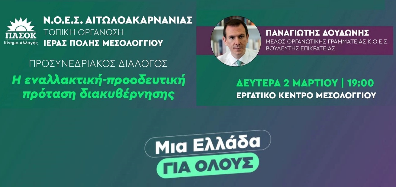 Προς αυτή την κατεύθυνση την Δευτέρα 2 Μαρτίου 2026 και ώρα 19:00 οργανώνεται πολιτική εκδήλωση στο Εργατικό Κέντρο της Ιεράς Πόλης του Μεσολογγίου, με αντικείμενο την εναλλακτική - προοδευτική πρόταση διακυβέρνησης του ΠΑΣΟΚ.