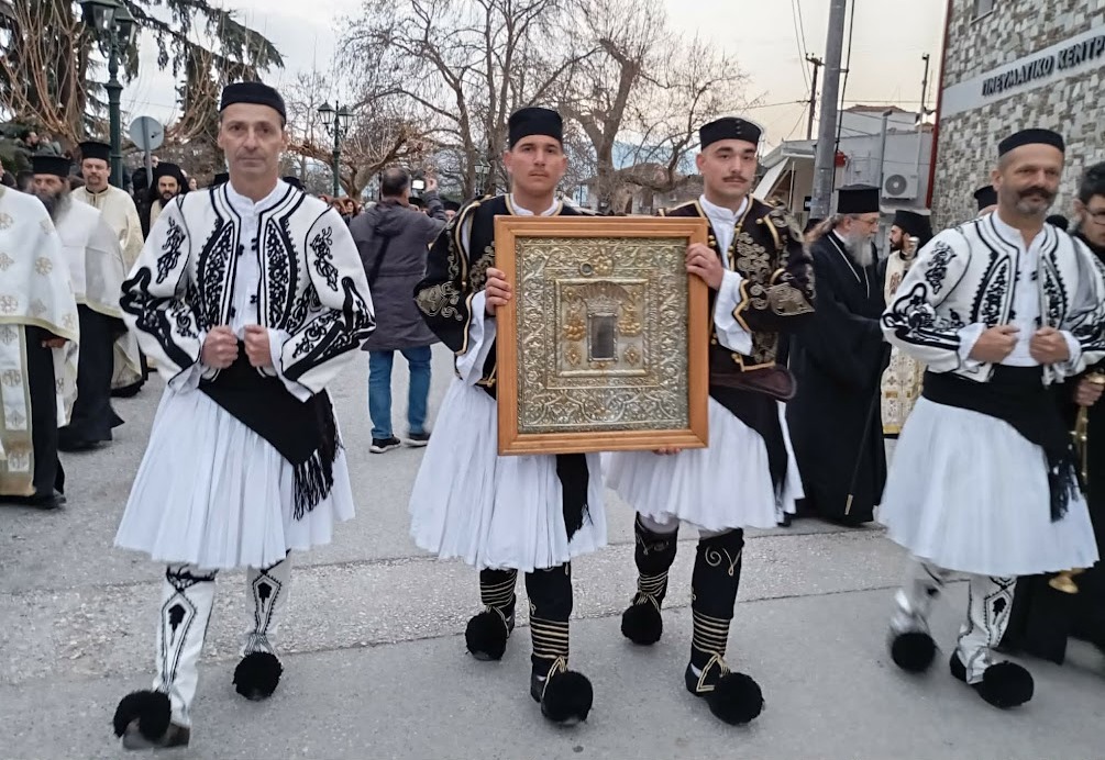 Η επίσημη υποδοχή πραγματοποιήθηκε στην κεντρική πλατεία του χωριού, ενώ ταυτόχρονα πραγματοποιήθηκε και η υποδοχή της ιεράς και θαυματουργού Εικόνος της Παναγίας της Ολυμπιώτισσας. Με λιτανευτική πομπή και με τη συνοδεία της φιλαρμονικής, των εκπροσώπων των τοπικών αρχών και πλήθους κόσμου τα ιερά σεβάσματα μεταφέρθηκαν στον Ιερό Ναό Κοιμήσεως της Θεοτόκου, όπου τελέσθηκε η Ακολουθία του πανηγυρικού Εσπερινού της Κυριακής της Ορθοδοξίας, χοροστατούντος του Επισκόπου Ρωγών κ. Φιλοθέου και συγχοροστατούντων του Μητροπολίτου Αιτωλίας και Ακαρνανίας κ. Δαμασκηνού και του οικείου Ποιμενάρχου, Μητροπολίτου Ελασσώνος κ. Χαρίτωνος.
