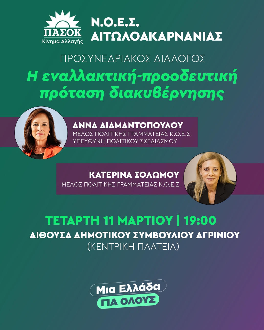 Η εκδήλωση οργανώνεται από την ΝΟΕΣ ΠΑΣΟΚ Αιτωλοακαρνανίας την Τέταρτη 11 Μαρτίου 2026, στην αίθουσα του Δημοτικού Συμβουλίου Αγρινίου (πρώην κτίριο Τράπεζας Ελλάδος) στις 19:00 και είναι ανοιχτή για όλα τα μέλη και τους φίλους της παράταξης.