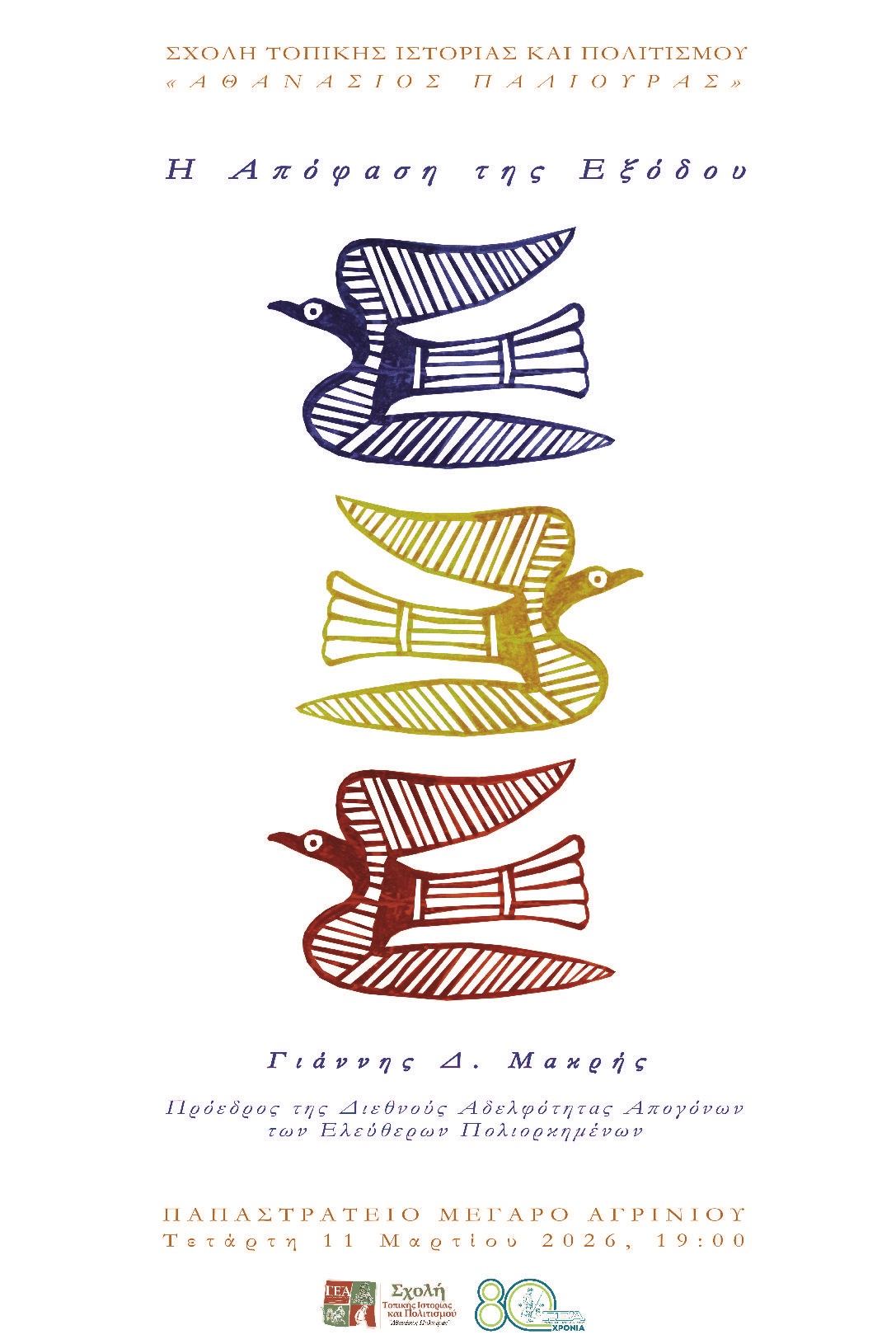 Η Σχολή Τοπικής Ιστορίας και Πολιτισμού "Αθανάσιος Παλιούρας", της Γυμναστικής Εταιρείας Αγρινίου, παρουσιάζει την Τετάρτη 11 Μαρτίου 2026 και ώρα 19:00 στο Παπαστράτειο Μέγαρο Αγρινίου τον πρόεδρο της Διεθνούς Αδελφότητας Απογόνων των Ελεύθερων Πολιορκημένων Γιάννη Δ. Μακρή. Θέμα της ομιλίας του: "Η Απόφαση της Εξόδου".