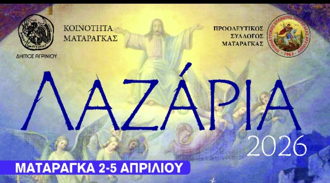 Ο Δήμος Αγρινίου και η Κοινότητα Ματαράγκας συνδιοργανώνουν τις επετειακές και ιστορικές εκδηλώσεις «Λαζάρια 2026», που θα πραγματοποιηθούν στην Ματαράγκα Αγρινίου. Συμμετέχουν πολιτιστικοί σύλλογοι, ομάδες, χορευτικά και τμήματα παρέλασης.